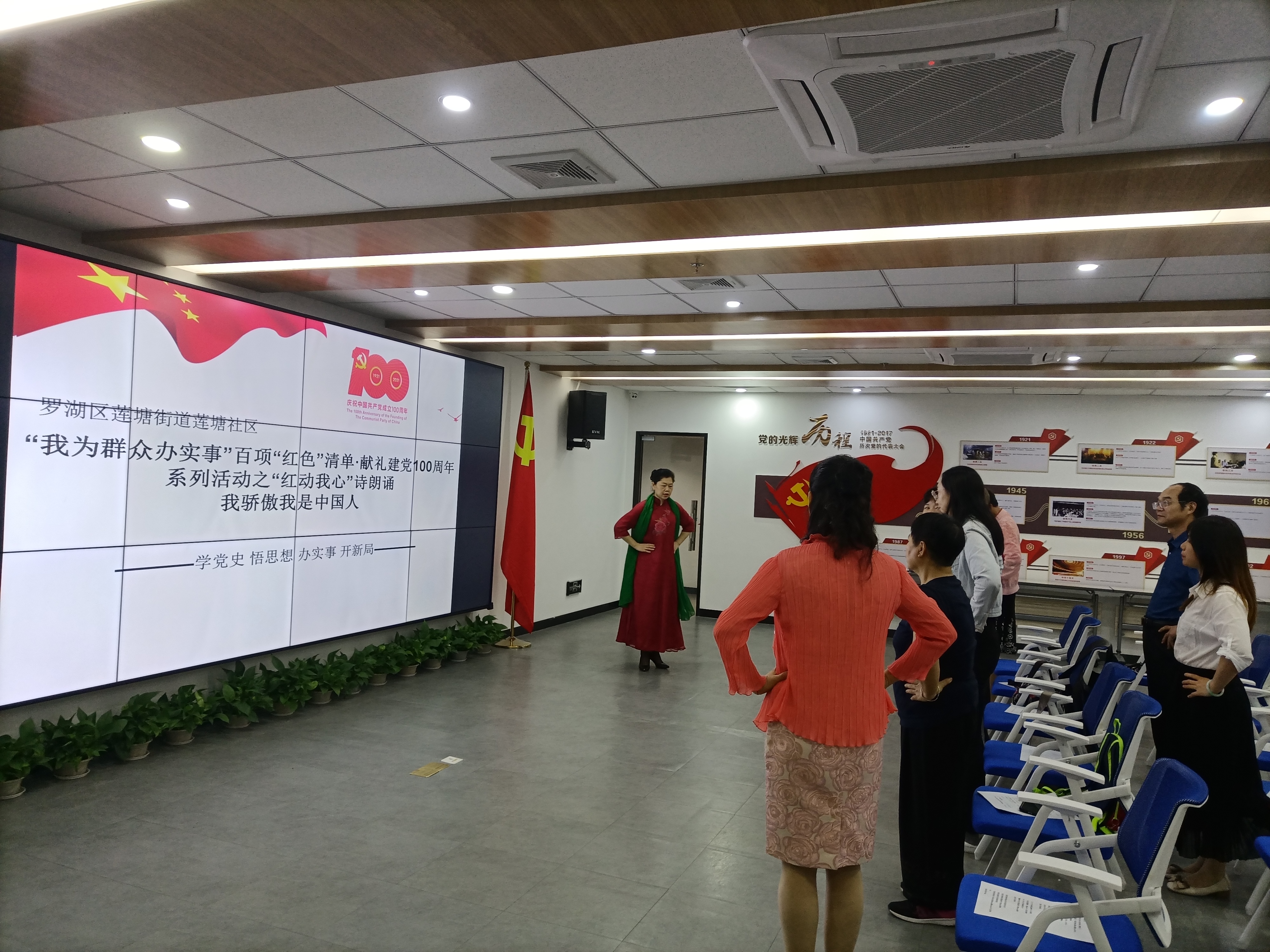 莲塘社区讯:莲塘社区献礼建党100周年系列活动——“我为群众办实事”百项“红色”清单之“红动我心”朗诵活动正式开启,2021年4月26日,莲塘社区党委组织居民群众在党群服务中心莲馨大讲堂内举行《我骄傲,我是中国人》诗歌朗诵。