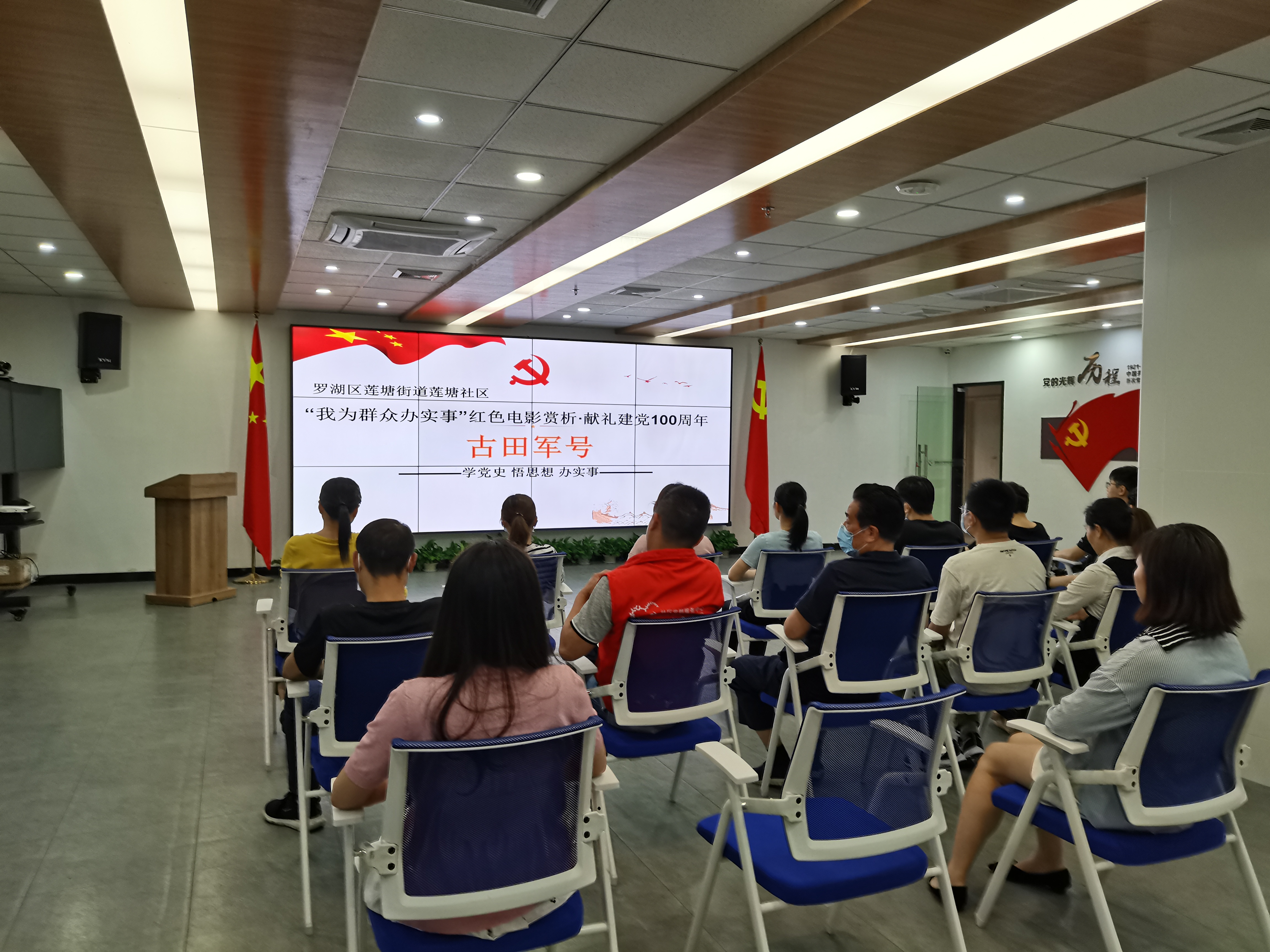 莲塘社区讯:2021年4月26日,莲塘社区党委开展献礼建党100周年系列活动——“我为群众办实事”百项“红色”清单之红色电影赏析,组织社区党员群众集中观看红色电影《古田军号》并做观后分享。