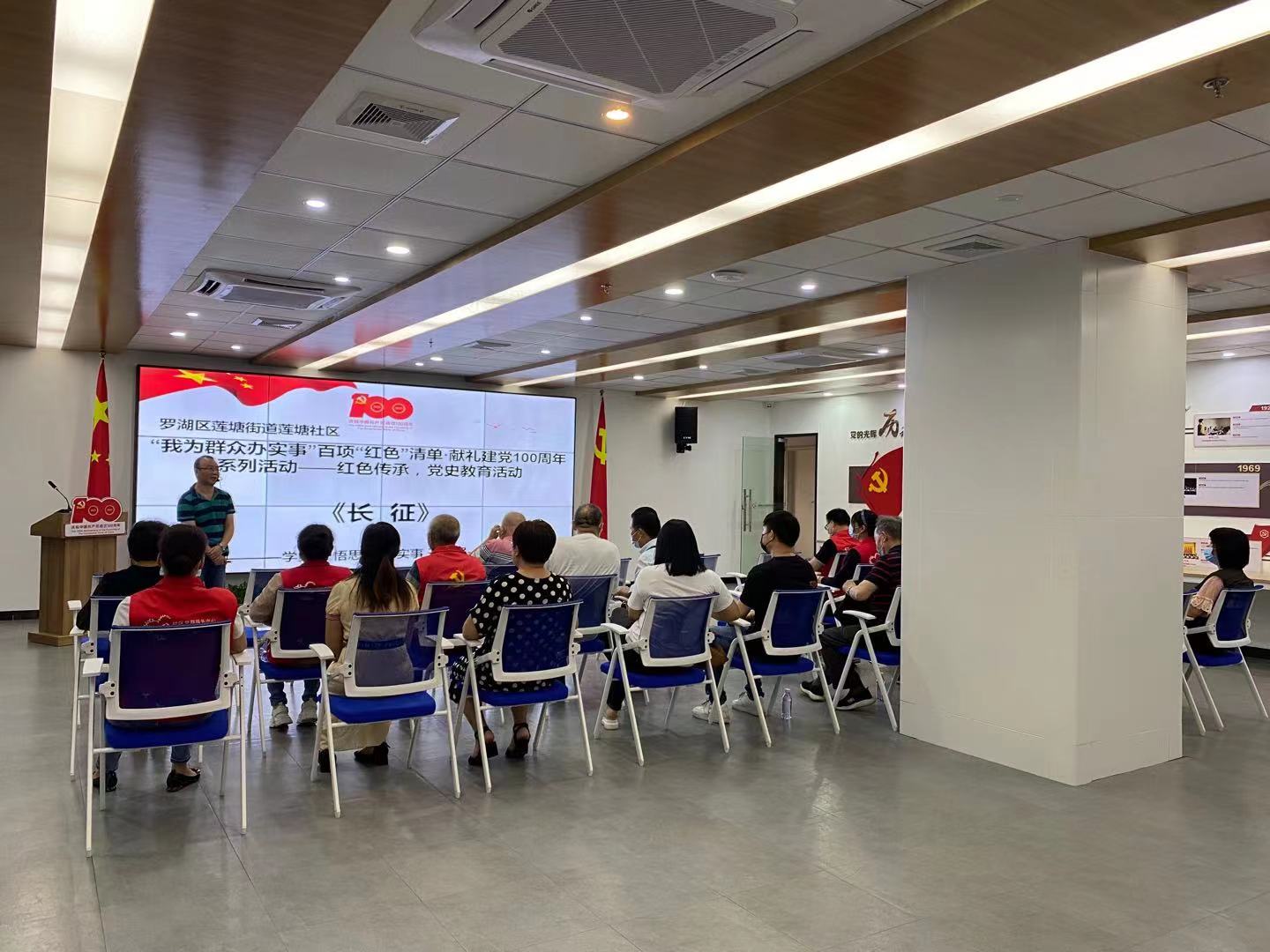 此次党史教育活动以《长征》为主题,社区党群服务中心公益讲师团邓老师带领大家学习长征从挫败走向辉煌的伟大历程,长征是历史纪录上的第一次,红军用两只脚,长驱两万余里,纵横十一个省,天上每日几十架飞机侦察轰炸,地下几十万国民党的大军围追堵截,路上遭遇说不尽的艰难险阻,在这样的环境下,红军克服重重困难,完成了长征,它向全世界宣告,共产党人是不可战胜的。