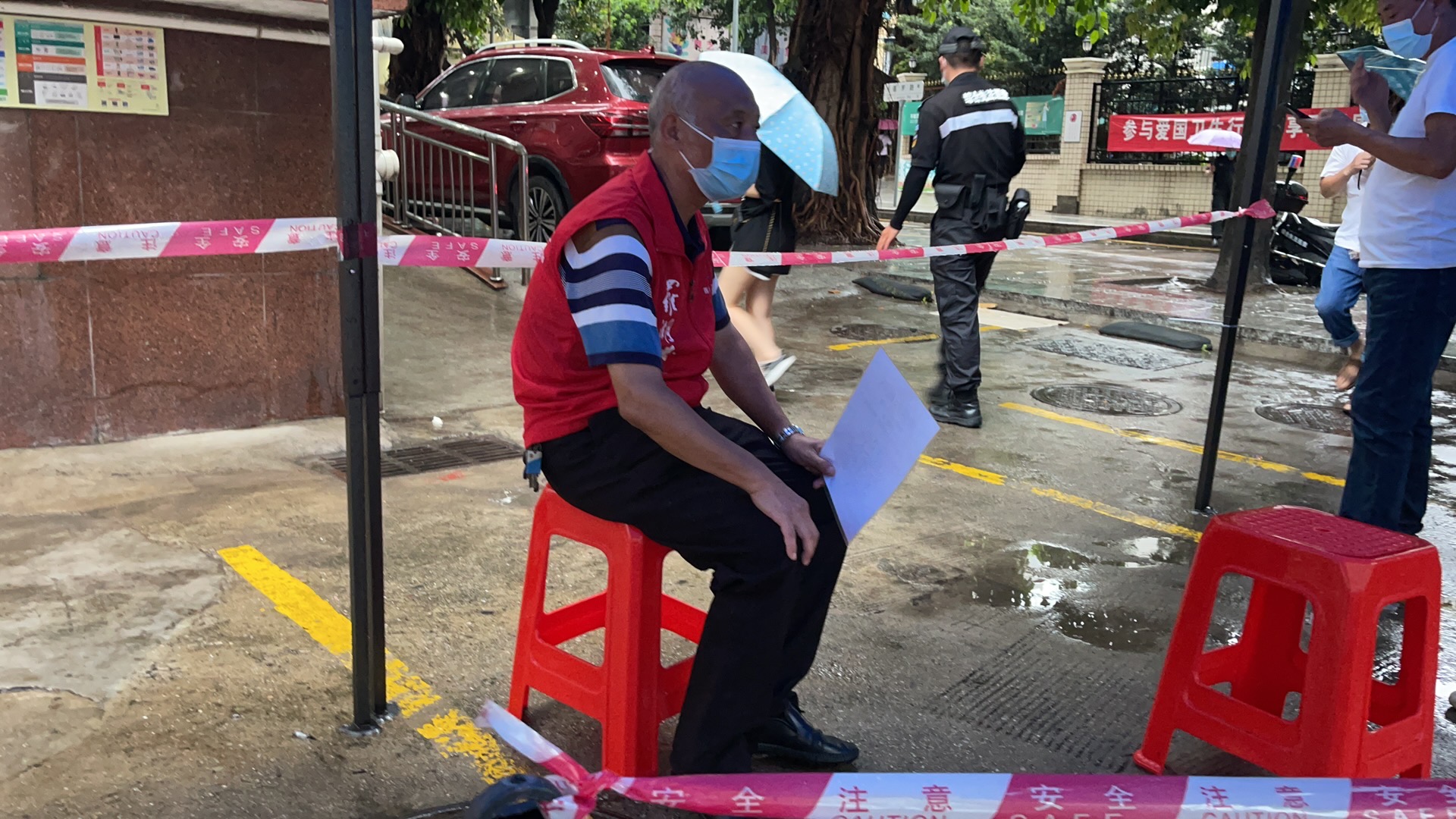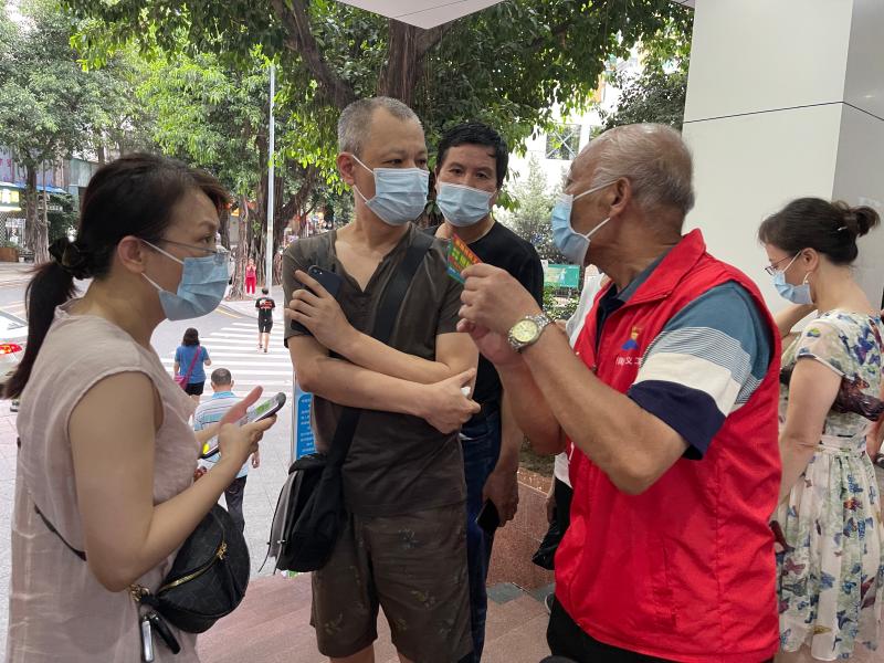 莲塘社区工作站的工作人员心疼老人家年纪大了,有时候故意不安排他做义工,他就偷偷跑去莲塘中医院做义工。安排他在人流较少的社康五楼,他却主动跑到外围来为居民答疑解惑。2021年6月1日下午,从1点到6点,在接待1500多人次后,繁忙的接种点终于冷清下来,一下午没有坐的老人家坐在凳子上,用手轻轻按摩着酸胀的腿……