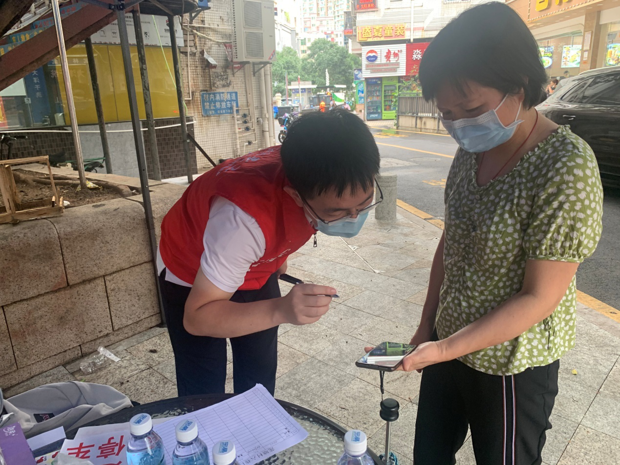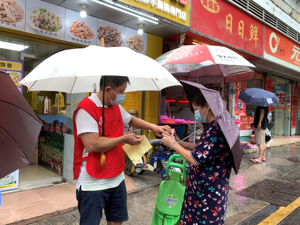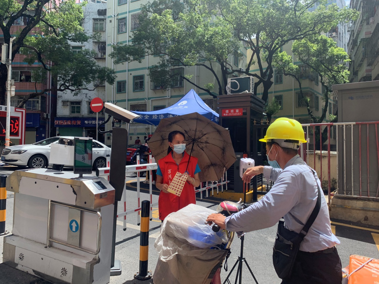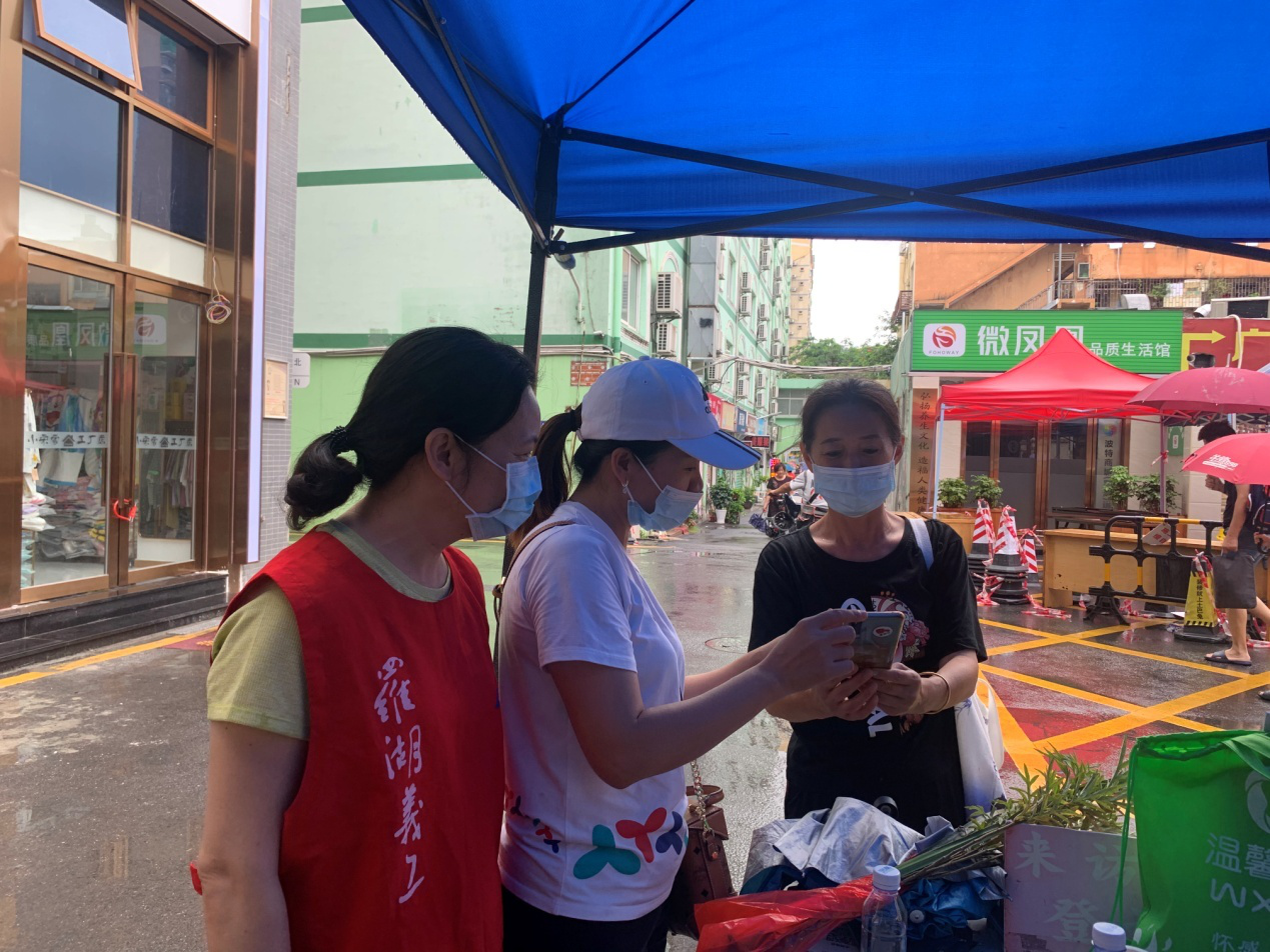莲塘社区讯:最近深圳的天气不是高温就是暴雨,对开展抗“疫”是不小的挑战,但无论晴雨,莲塘社区疫情防控工作人员,始终奋战在防疫一线,全力以赴持续作战。为加强端午假期疫情防控,保障居民安全,6月12日—14日,莲塘社区的市、区、街道下沉干部、社区工作人员以及志愿者们无惧风雨,每天准时出现在辖区内的16个卡口为居民服务,对进村和小区人员测量体温,检查行程码和健康码,同时继续为市民发放便民贴贴纸。