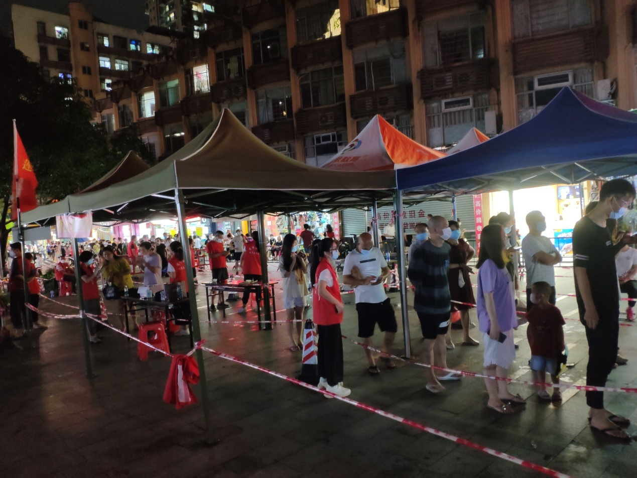 莲塘社区讯:6月23日晚,莲塘社区核酸检测点本应10点结束采样,这时碰巧来了一批刚下班回来的居民,于是采取延时服务的方式,最大限度满足居民群众核酸采样需求。在核酸检测点现场,医务人员、下沉干部、社区工作人员和志愿者们齐心奋战,居民戴好口罩,有序排队,做到应检尽检。