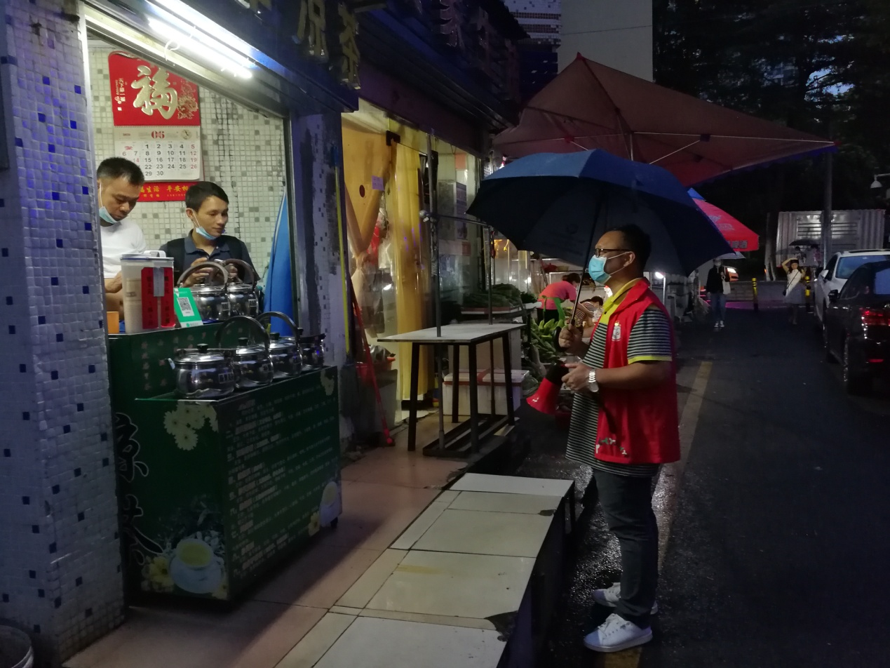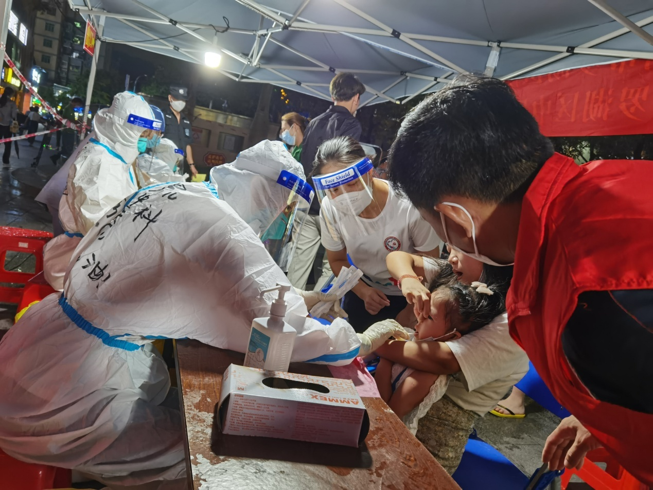当晚,莲塘社区全部工作人员压在核酸检测一线,社区党委书记王建平亲自上阵带领社区工作人员拿着喇叭穿梭于街巷中,鼓励居民前往核酸检测点做核酸采样。大喇叭宣传+现场引导,工作人员和居民相互理解配合,保障了核酸检测工作的有序进行。大雨瓢泼,却丝毫没有削弱居民前来进行核酸采样的热情,为抗疫贡献个人力量。