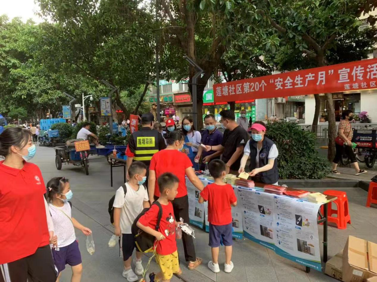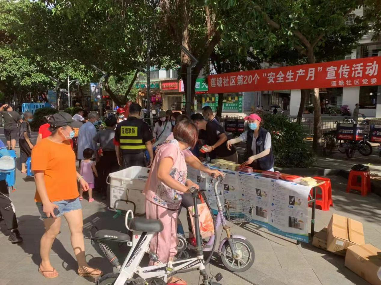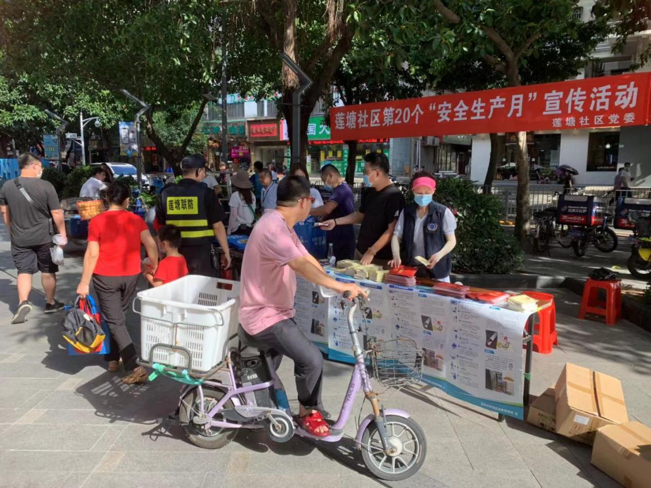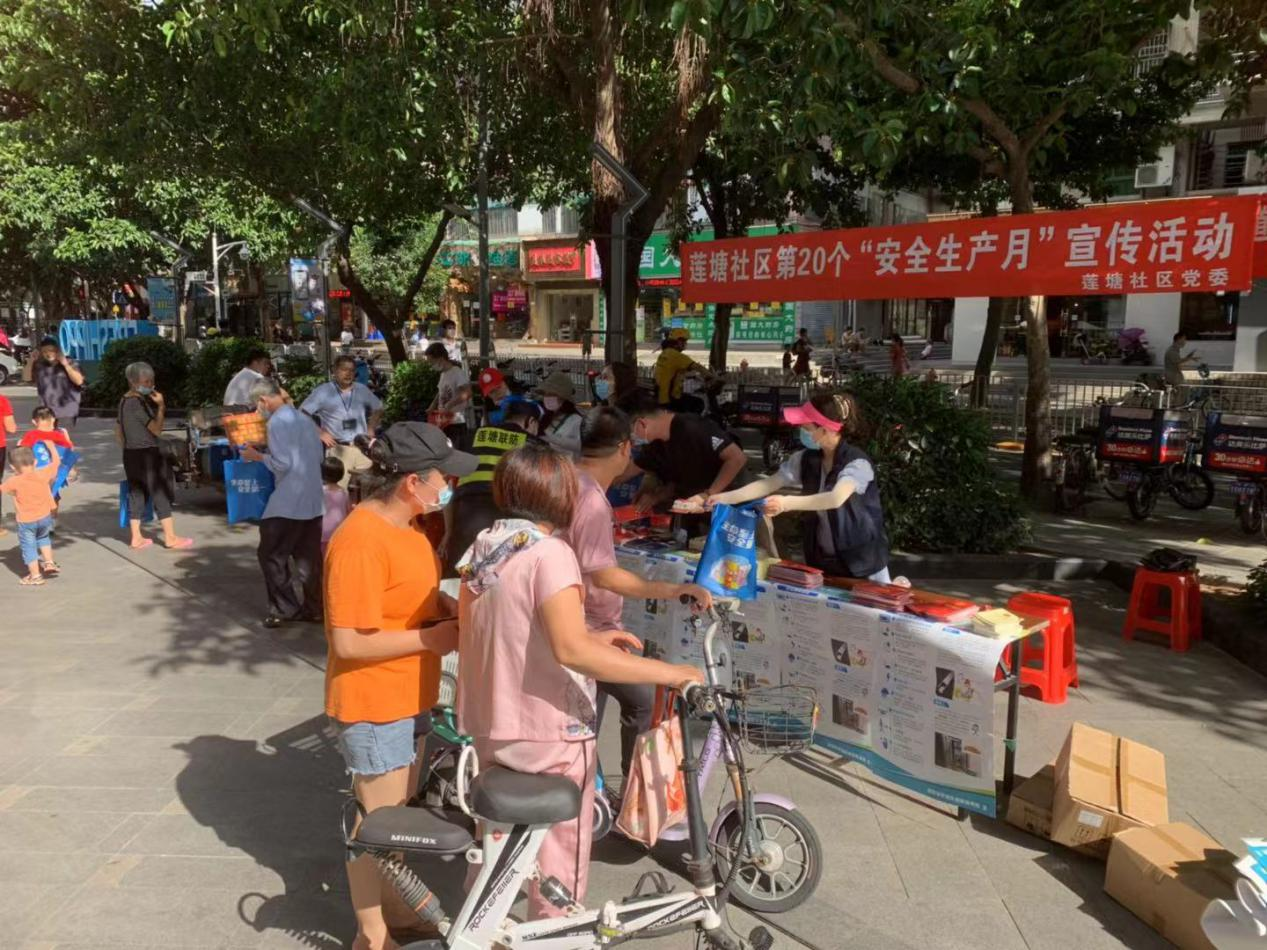 莲塘社区讯:为深入贯彻落实习近平总书记关于安全生产重要论述,扎实推进安全生产专项整治三年行动集中攻坚,2021年6月25日下午,莲塘社区在盒马里岁宝广场,组织开展“安全生产月”宣传活动。