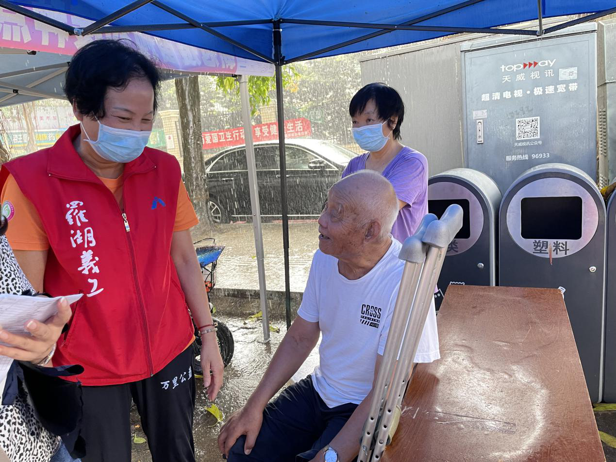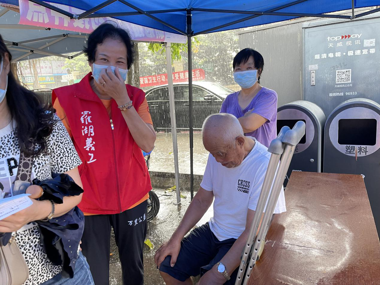 莲塘社区讯:2021年7月5日上午11点,一场突如其来的狂风骤雨席卷了莲塘社康疫苗接种的现场。此时前来接种疫苗的以老人居多,担心他们淋雨着凉,莲塘社区的工作人员和义工快速将老人们安顿到帐篷下面避雨。大雨滂沱,我们看到帐篷下坐着一位白衣老人,他把拐杖放在一边,坐在凳子上面对着大雨露出了无助的表情。莲塘社区义工胡月红见状,马上走到老人面前,“阿叔,您是哪里人吖?以前我老家吖,夏天经常发大水。”……她陪老人聊天,教老人保健操,看着面前这位身穿红马甲义工的逗趣和关爱,阿叔开心地笑了,周边的人也笑成花儿。胡月红姐姐是个内敛的人,平时总是默默地做事,话并不多,生性腼腆的她这次为了逗老人开心,可是“豁”出去了。“老人家慈祥又可爱,您的笑容,我的幸福”胡月红羞涩地笑起来。