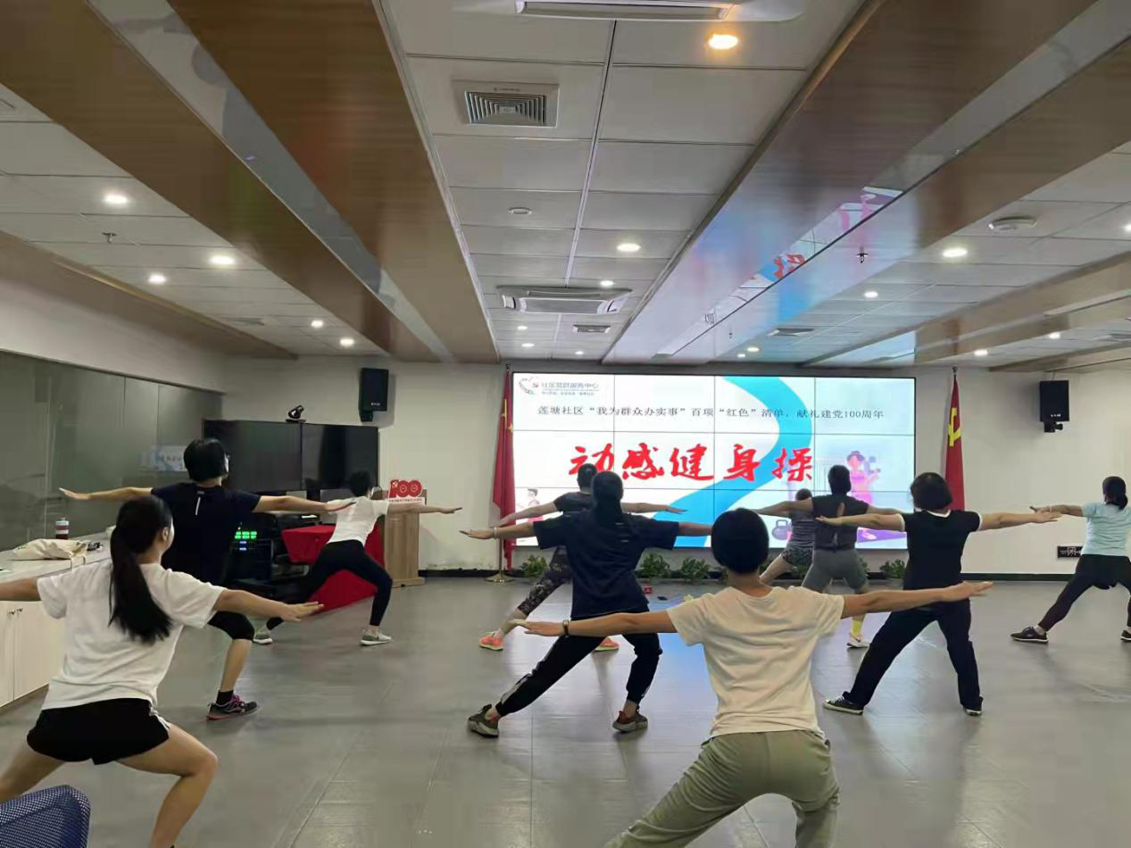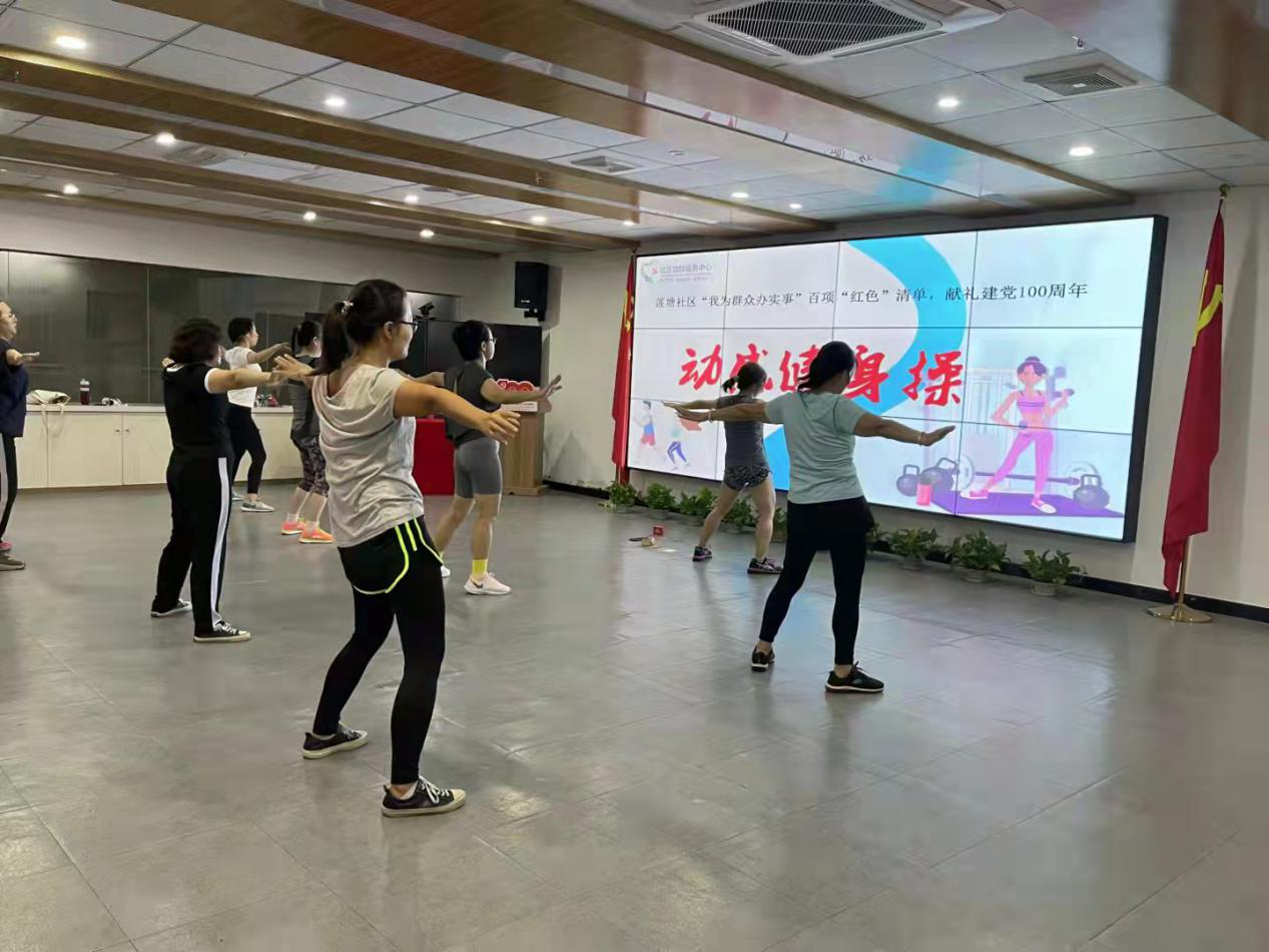 莲塘社区讯:为丰富社区居民的业余文化生活,进一步推广科学、健康的生活理念,2021年10月13日下午,莲塘社区工作站在党群服务中心多功能活动室开展了动感健身操活动。伴随着欢快的节奏,居民们在老师的指导下,踏着律动十足的节拍,挥洒汗水,让身体更加灵活健康。