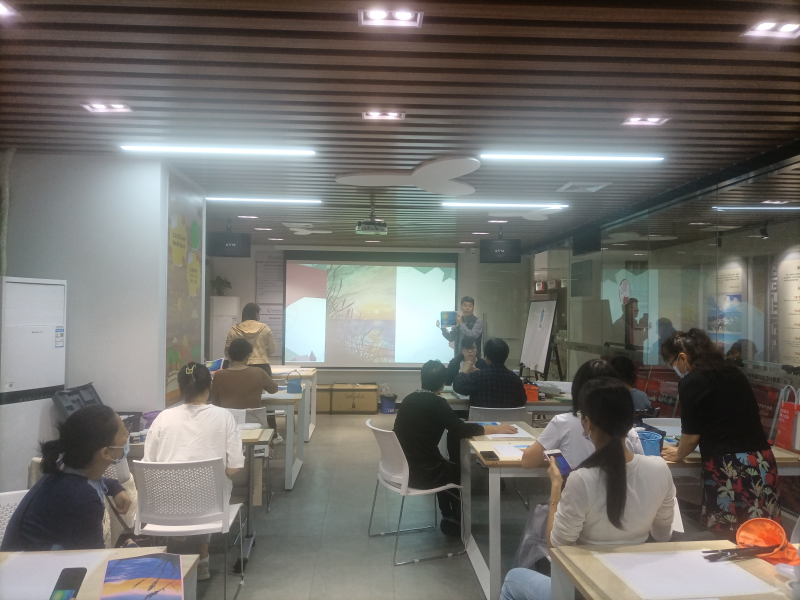 在莲塘社区社工刘化梅简单地开场后,蒋凤军老师为大家讲解了水粉画的性质和技法,并邀请大家一起欣赏了水粉画优秀作品:郊外的夜晚、秋天的层林尽染、梧桐山的峰峦叠翠……,一幅幅写实画卷引发人们对美好的向往和追求。理论知识和鉴赏过后,蒋老师带领大家进入实操阶段,学员们纷纷拿起画笔、颜料、纸张,用水调色,叠加上色,在蒋老师的指导下,大家的作品色彩逐渐饱满起来,一幅幅美丽的风景跃然纸上,浸润人心。