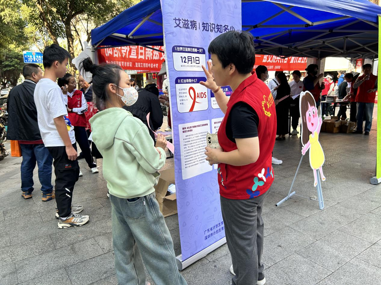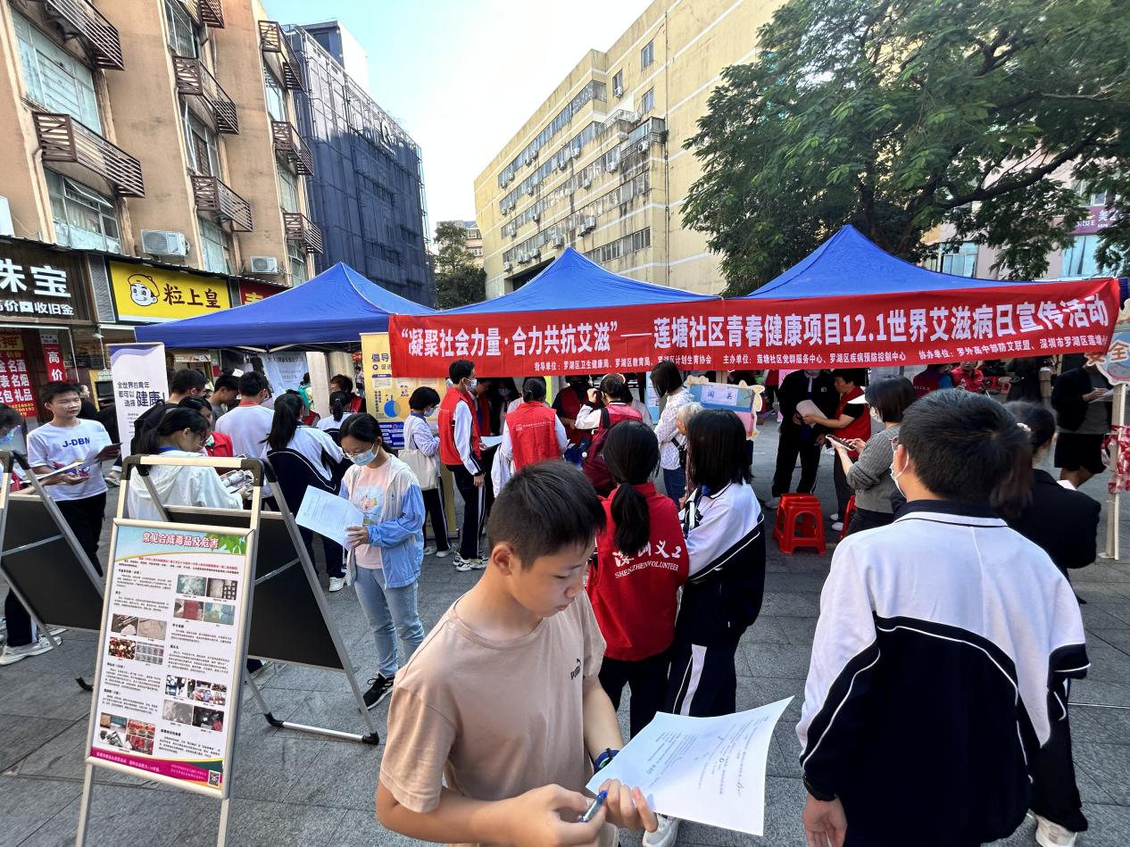 莲塘社区讯:2023年12月1日是第36个“世界艾滋病日”。为进一步提高辖区居民群众特别是青少年对艾滋病的认识和预防意识,结合社区青春健康教育项目,11月26日下午,莲塘街道莲塘社区联合罗湖区卫生教育局、罗湖区教育局、罗湖区计划生育协会、罗湖区疾病预防控制中心在麦当劳小广场开展“知性防艾 护航青春”青春健康项目科普宣传活动,共有600余名居民群众参加现场活动。