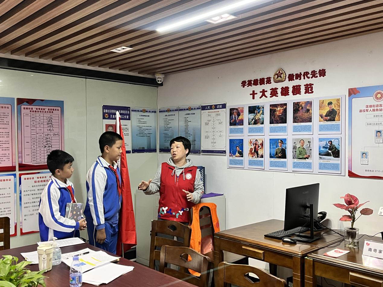 在社工主任谢南的带领和讲解下,少先队员们通过观看文化长廊的图文展览,从纵观莲塘、往昔莲塘、莲塘新貌三个方面了解莲塘的发展史,深入学习建设者的感人事迹。参观过程中,他们看到了由社区工作人员、党员志愿者等组成的志愿服务队,认真听志愿者们几十年如一日地坚守和奉献;他们用心记录自己所见所感,积极参与互动,更加深刻地认识到现在的幸福生活来之不易,感悟了建设者们艰苦奋斗、为民造福的初心及使命。