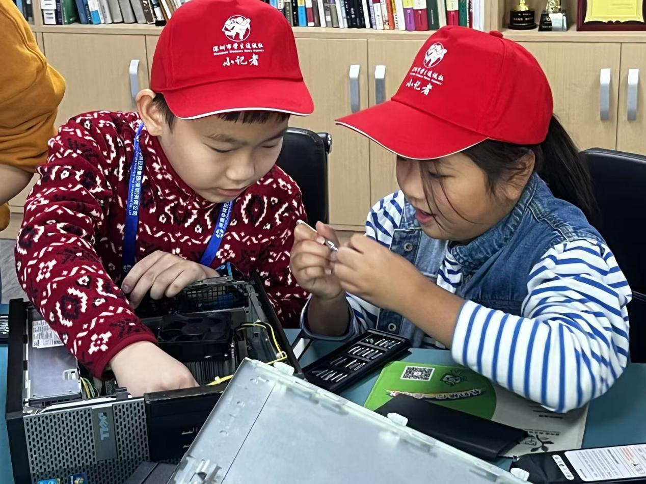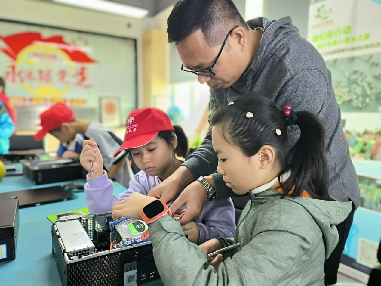 采访环节后,杨老师还带着小记者们动手拆、修电脑。小记者和家长们在杨老师专业指导下小心翼翼地拆解废旧电脑,了解电脑的内部结构和各个部件的功能,尝试修复电脑故障,体验了让废旧计算机再生的过程。这一环节不仅让小记者们锻炼了动手能力,还让他们深刻体会到了电子产品循环利用的重要性。