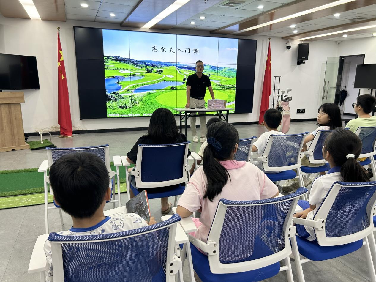 活动分为高尔夫讲解和推杆练习两部分。活动开始时,老师向孩子们介绍了高尔夫的起源、发展历程、全球影响力等,并通过PPT展示精美的图片带孩子欣赏世界各地的高尔夫球场风景,激发孩子的兴趣。然后,老师还聚焦高尔夫的基本规则与技巧,用通俗的方式讲解了“杆数”“发球区”等基础概念,并示范了握杆、站姿与挥杆击球动作要领。经过一番有趣的示范和讲解后,大家都跃跃欲试。在老师的指导下,孩子们依次站到模拟器前,尝试挥杆击球,感受击球的快感和高尔夫运动带来的乐趣。