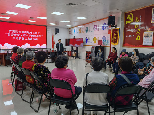 畔山社区党委书记罗思诚首先向各位居民送上新春祝福,希望大家畅所欲言,谈谈自己在这个不一样的春节留深过年的感受。主持社工用生动有趣的击鼓传花猜谜语的游戏拉开了活动的帷幕,带动了现场的活跃气氛,在一片欢笑声中大家开始畅谈起来。常阿姨主动带头分享起来,她表示今年在深过年也很放心很开心,深圳的疫情控制的特别好,尽管因为全球疫情她的女儿和孙子在国外不能团聚,但能通过视频拜年和分享新春的喜悦,内心很满足了。接下来邓阿姨热情洋溢地说:“今年留深过年真的好开心,深圳天气好,环境好。与往年不一样的感受是今年收到女儿的红包了,女儿开始工作了,心里很宽慰,长江后浪拍前浪,一代更比一代强,也祝福祖国蒸蒸日上。”然后一位70来岁的长者欣喜地说:“这是我第一次在深圳过年,因为孩子们不能回去,就来到深圳一起过年了。感觉深圳的社区真的很好,娱乐设施多,社区工作人员还很热心。孩子们还带我去了很多旅游景点,玩的好开心。”接着一位将近80岁的张阿姨激动的分享起来,她说:“今年对我来说是一个特别不一样的年,因为老伴去年走了,除夕那天到儿子家一起过年,儿孙都很孝顺,很开心。虽然现在是一个人住,但也过的很丰富多彩,社区工作人员经常来看望我,带我参加各种社区活动,我感觉特别幸福,感谢党和政府的关怀。” 她还特地写了一首叫«老年乐»的诗来表达她的心情,其中一段“春风吹来百草香,人老越活越年轻。正月十五闹元宵,你唱我跳多热闹。这样的日子没过够,还想再活一百年。”写出了社区长者们普遍的心声.……