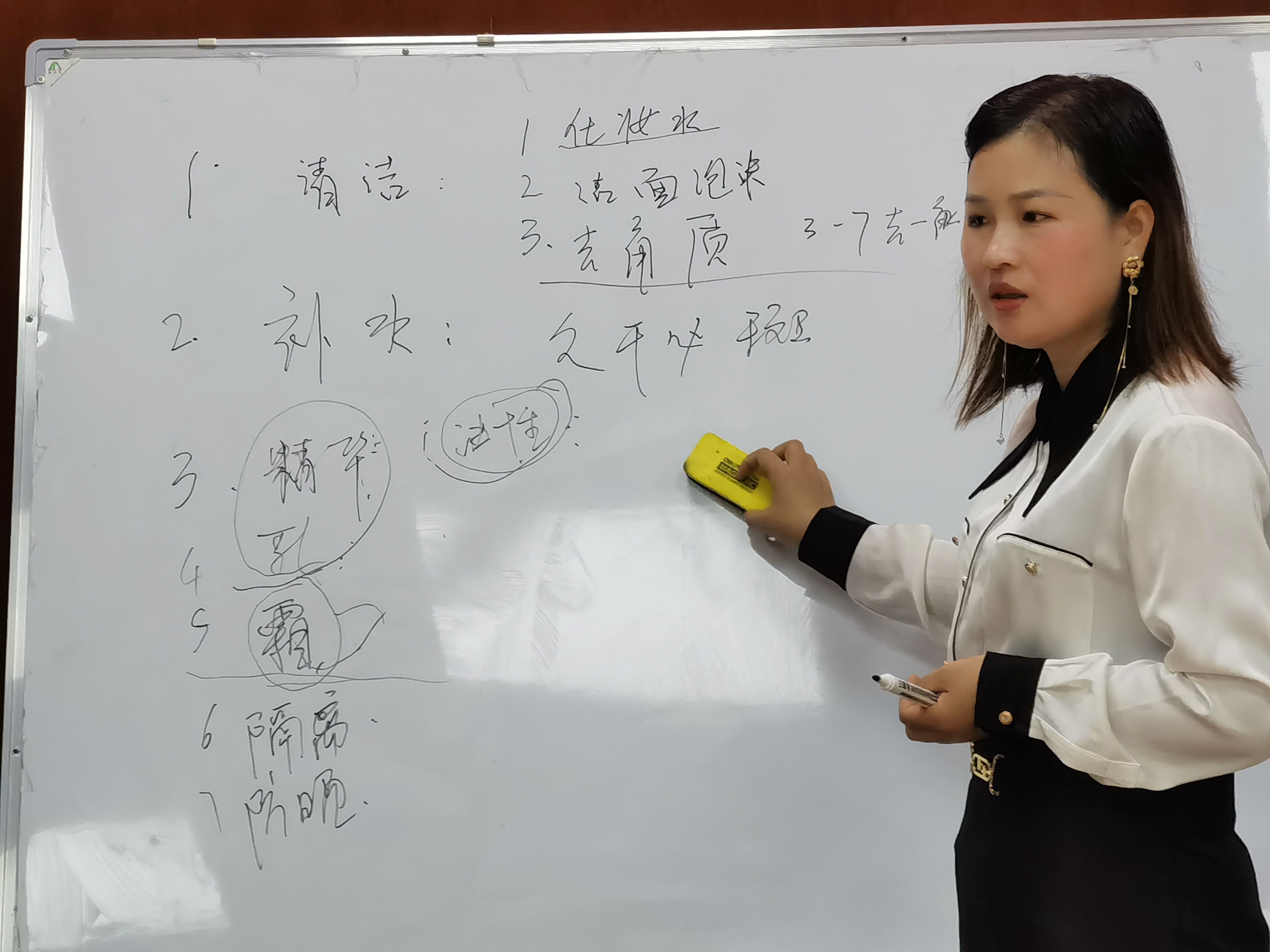 今天为大家讲课的老师有20多年的美容经验,专门到学校为学生讲课的老师。陈老师首先为大家分享脸部清洁步骤和日常护肤技巧;各种常见皮肤浅析;护肤流程及护肤知识。其次,解答了现场人员的困惑问题,如:长斑、黑色素应怎样护理;如何判断你的肌肤缺水;怎样让肌肤锁住水分等等一系列的问题。