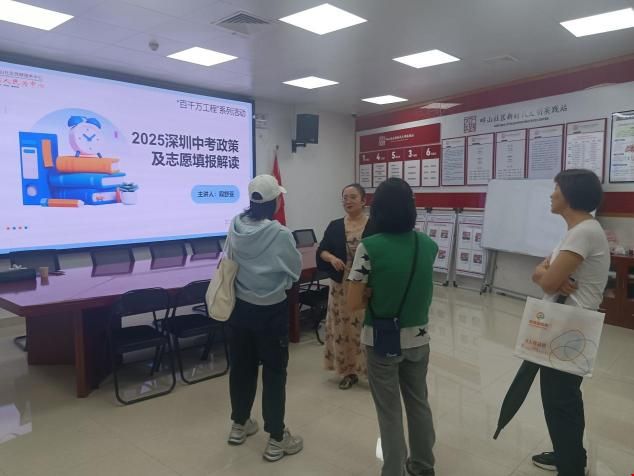 本次活动特邀请辖区专业机构,组织初中段家长学习宣讲《2025年深圳市中考志愿填报指南》和深圳市2025年中考政策解读,重点关注政策变化和政策要求,以及志愿填报批次说明。并特别提醒家长切勿盲目追求“名校光环”,选择适合的教育才是最好的教育。建议中考志愿填报过程中家长务必和学生充分沟通,避免发生分歧造成孩子心理负担。同时让家长了解深圳市2025年中考报名和填报志愿时间、缴费,以及英语听说能力测试、艺术学科考查、文化考试、生物地理考试、自主招生和指标生的考试等中考时间安排。向家长们明确录取和就读规则、平行志愿填报技巧等核心内容,解答家长心理困惑。