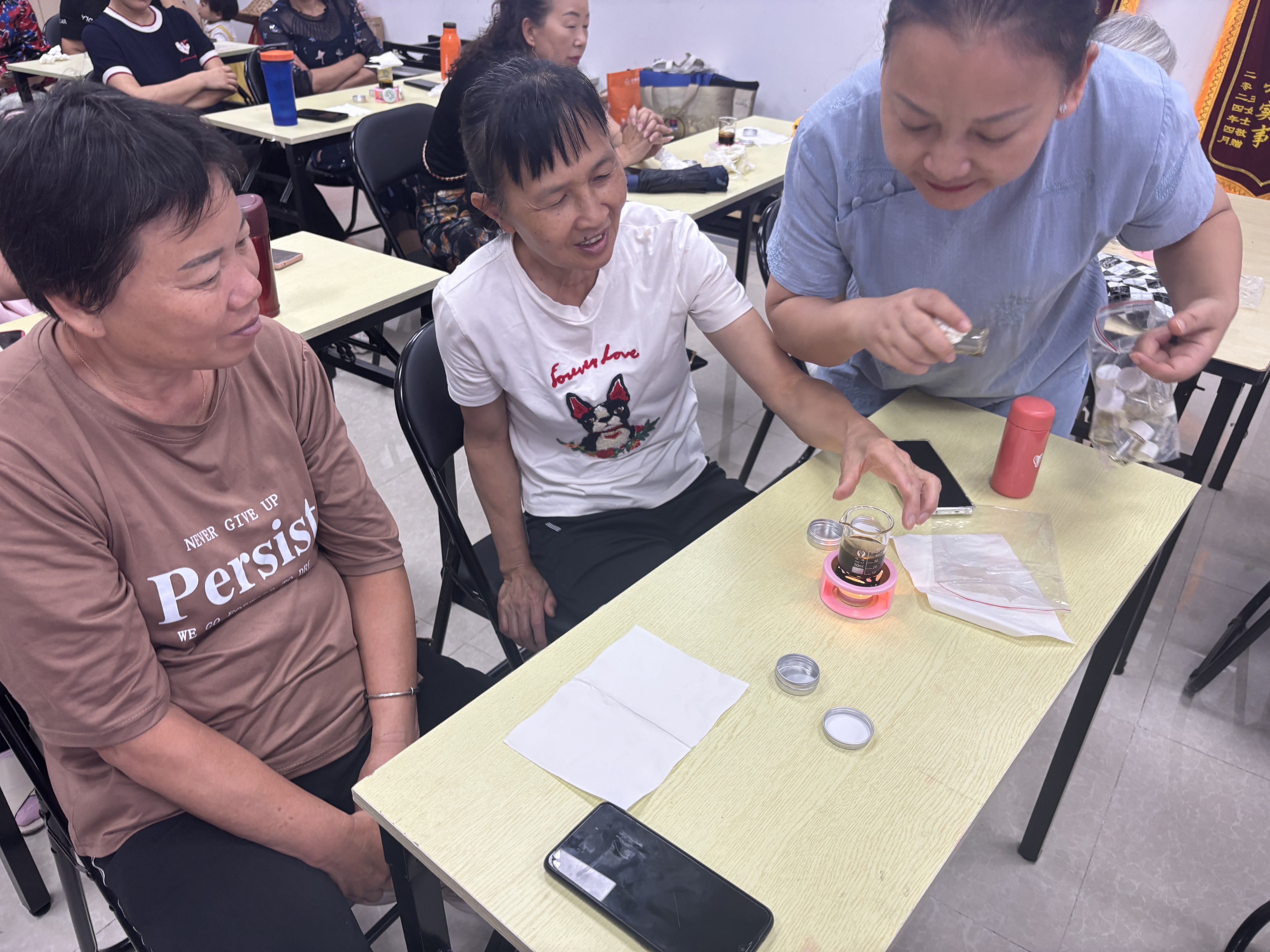 活动开始,社工向居民们送上节日祝福,并介绍了本次活动的意义,希望通过亲手制作艾草膏,让大家深入了解端午习俗,拉近邻里之间的距离。随后,由专业的手工老师,带领居民们走进端午文化的世界。从端午节的起源、各地特色习俗,到艾草在传统民俗中的驱邪防病寓意,再到现代医学视角下艾草的抗菌、消炎等功效,深入浅出的讲解让居民们听得津津有味。在艾草膏制作教学环节,讲师详细演示了材料配比、加热萃取、冷却成型等步骤,并强调安全操作要点。称量蜂蜡、搅拌艾草与橄榄油、倒入模具…… 大家一边制作,一边交流心得,现场欢声笑语不断。