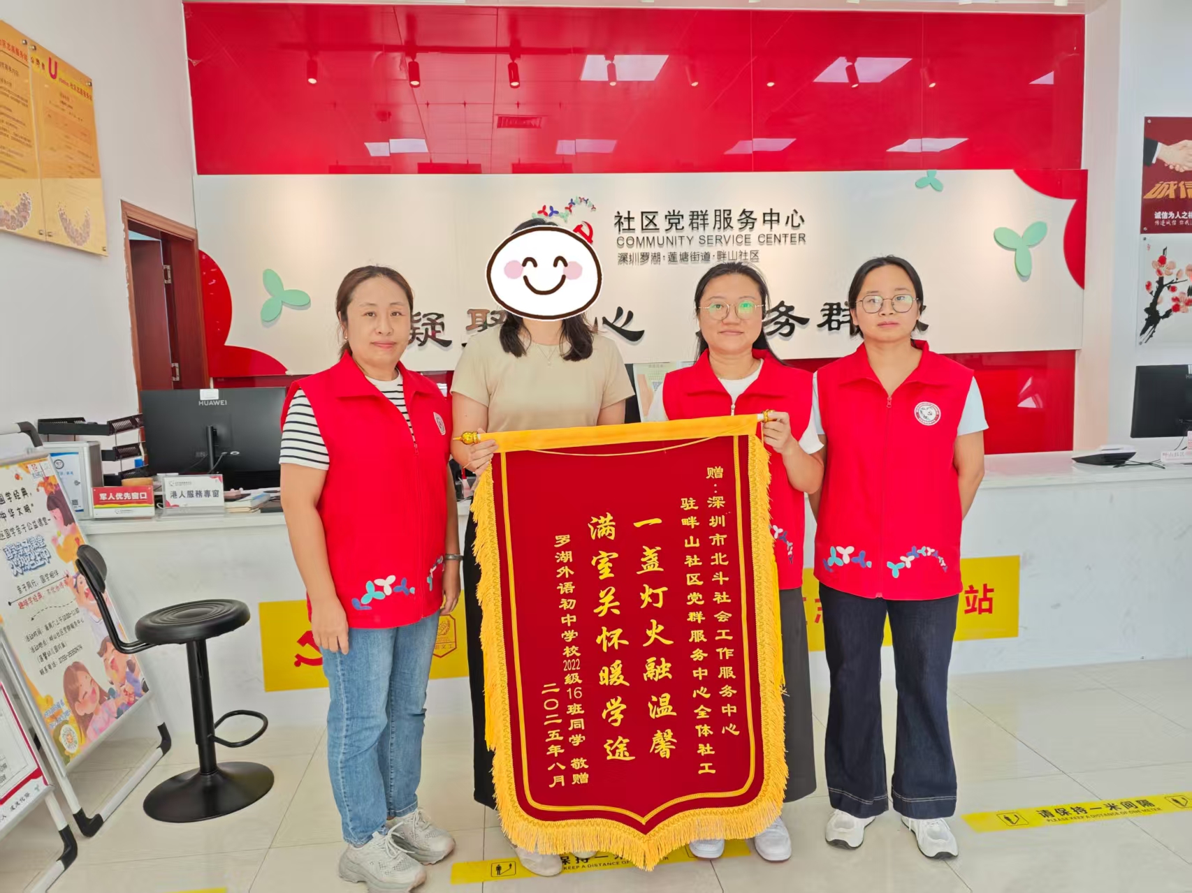 近日,在莲塘街道畔山社区党群服务中心,一场温馨的致谢仪式悄然举行。罗湖外语初中学校2022级16班的学生代表将一面书写着“一盏灯火融温馨,满室关怀暖学途”的锦旗,郑重赠予深圳市北斗社会工作服务中心的全体社工,以此感谢他们在夜间自习课堂中提供的暖心陪伴与专业支持。