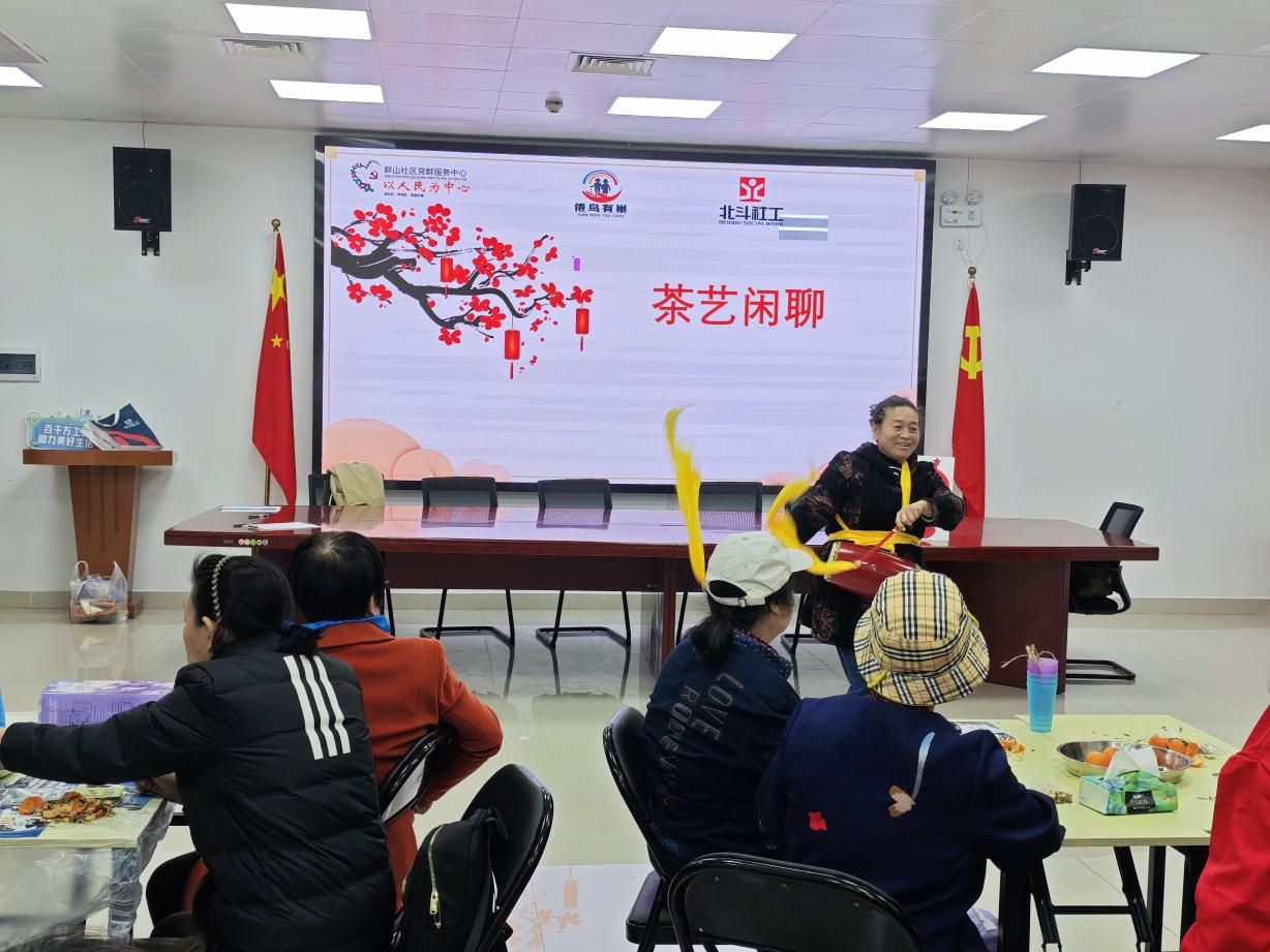 “乡音猜猜”互动环节,社工现场邀请不同籍贯的长者用家乡话说一句话,让大家猜猜看。四川话的“要得嘛”、湖南话的“恰饭哒”、广东话的“早晨”、吉林话的“嘎啦”……当熟悉的乡音在活动室里响起,长者们瞬间眼睛发亮,纷纷举手抢答。来自湖南的蒋阿姨高兴地用家乡话唱起了歌,请大家猜歌词意思;互动之间,原本有些拘谨的长者们彻底放松下来,乡音成了连接彼此的温暖纽带,活动室里满是欢声笑语。闲聊之余,大家还纷纷上台展示才艺:张阿姨带头跳起了腰鼓,一亮相便赢得满堂喝彩;紧接着,太极爱好者带动大家一同练起了太极,共同健身。才艺接连登场,掌声不断,原本陌生的面孔在音符与笑语中愈发亲切。茶话会接近尾声时,工作人员为每位长者送上了精心准备的新年福袋。