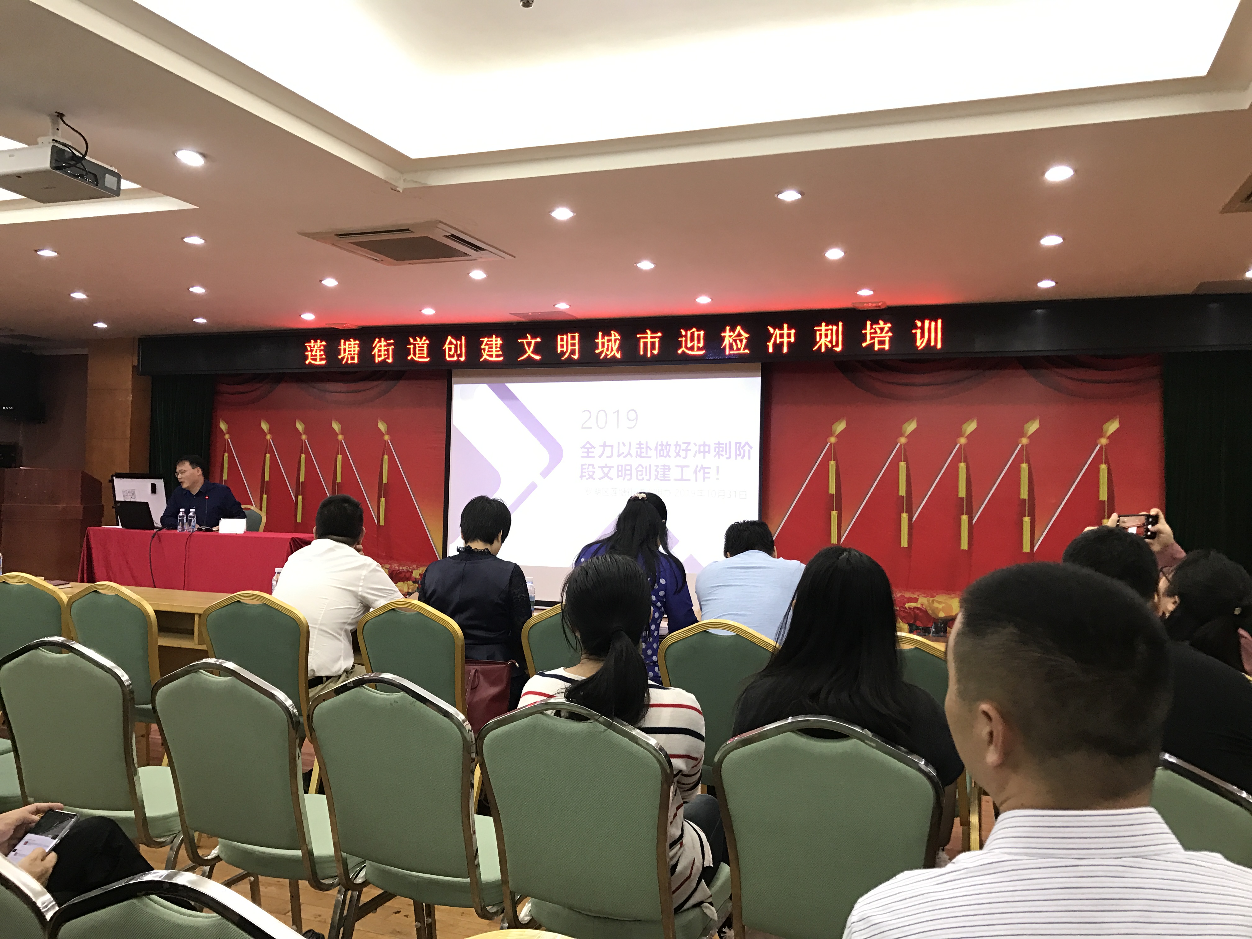 罗湖家园网讯:为进一步做好2019年全国文明城市迎检测评工作,2019年10月31日下午,莲塘街道办在莲塘街道2楼A会议室召开创建文明城市创建迎检冲刺培训。鹏兴社区工作站站长胡红、创文工作人员以及各物业管理处主任参加这次培训。