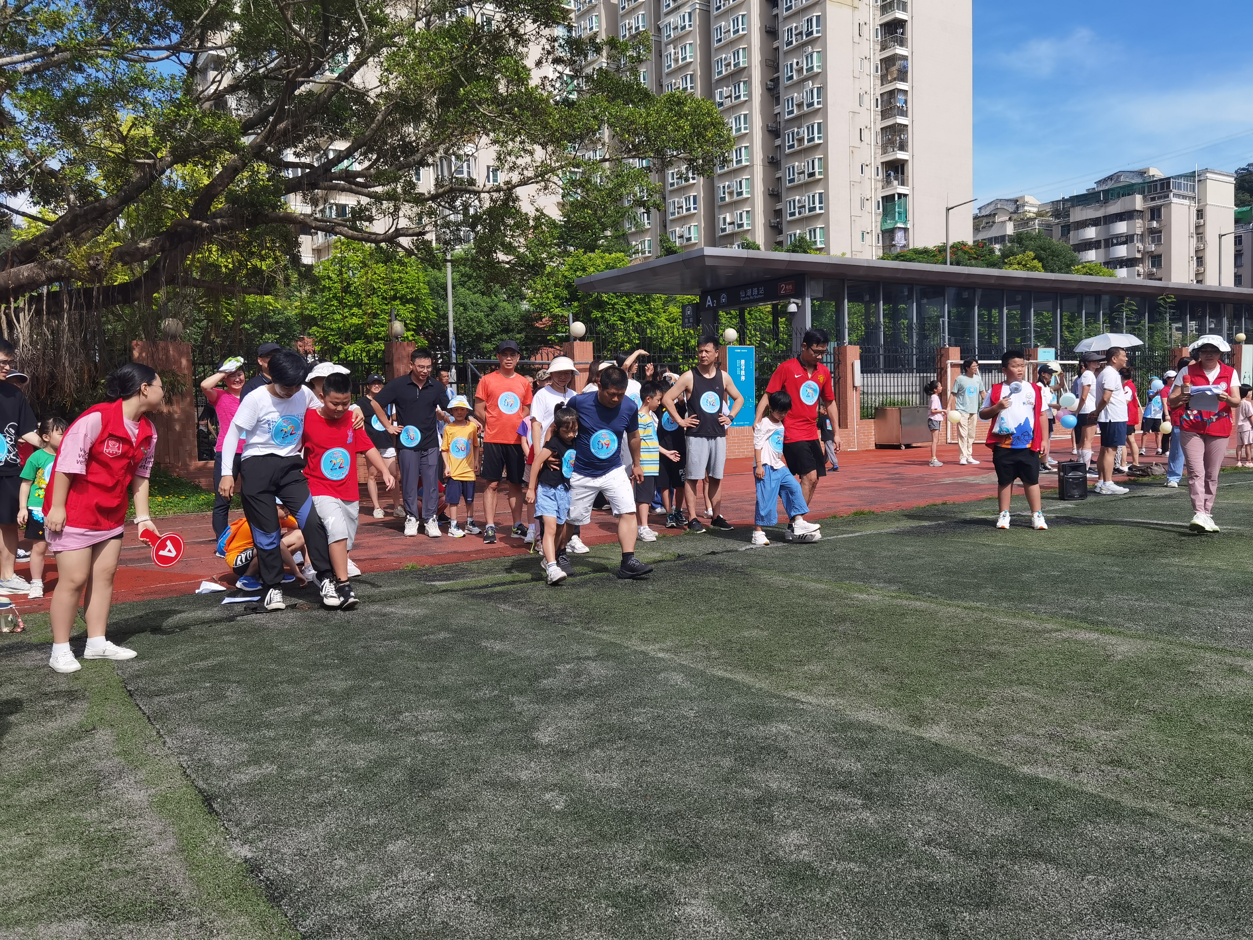 罗湖家园网讯:处暑已至,暑气渐消,天气宜人,在鹏兴实验学校的操场上,8组家庭正在比赛亲子绑腿跑,孩子和家长齐心协力,手挽手、喊着口号向终点快速移动。在赛道的一旁,加油声、欢呼声,人声鼎沸。