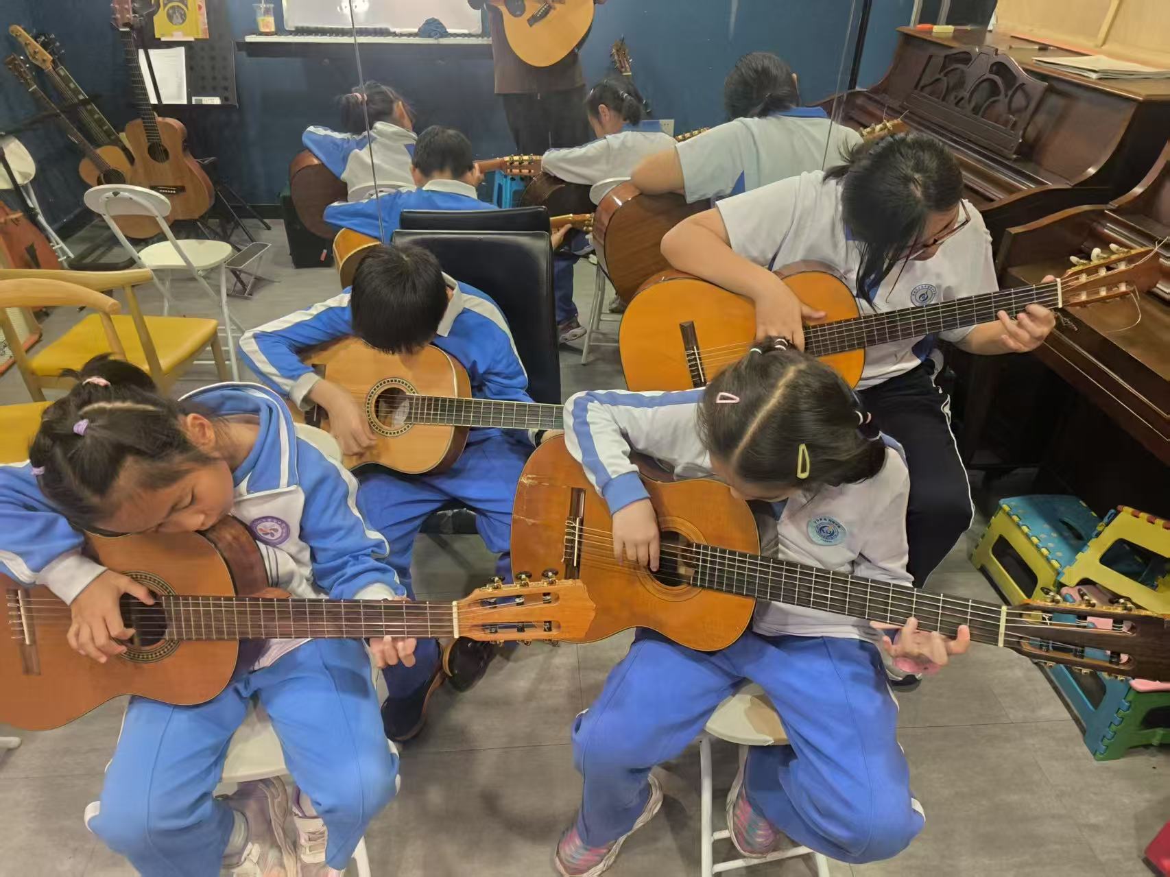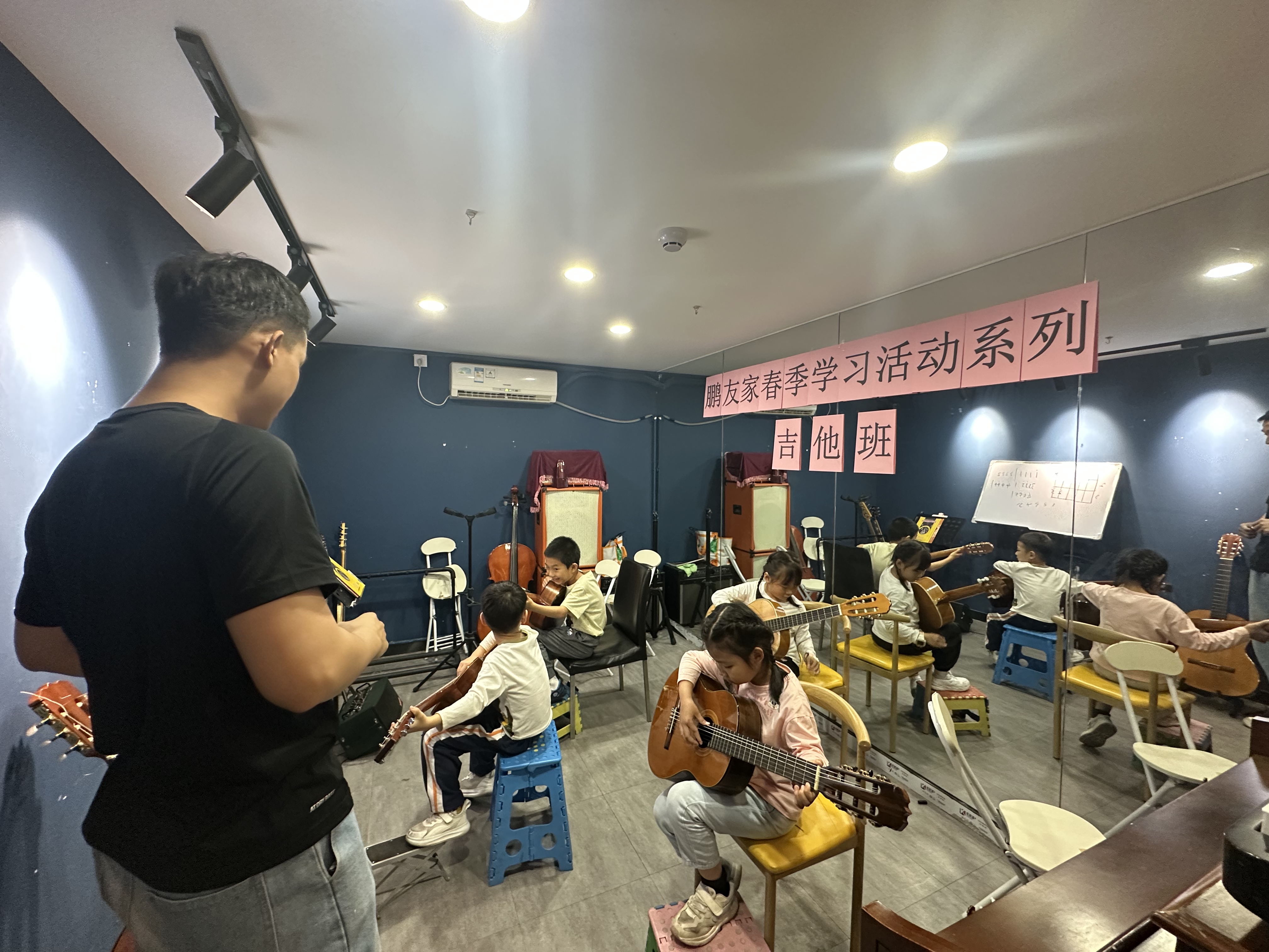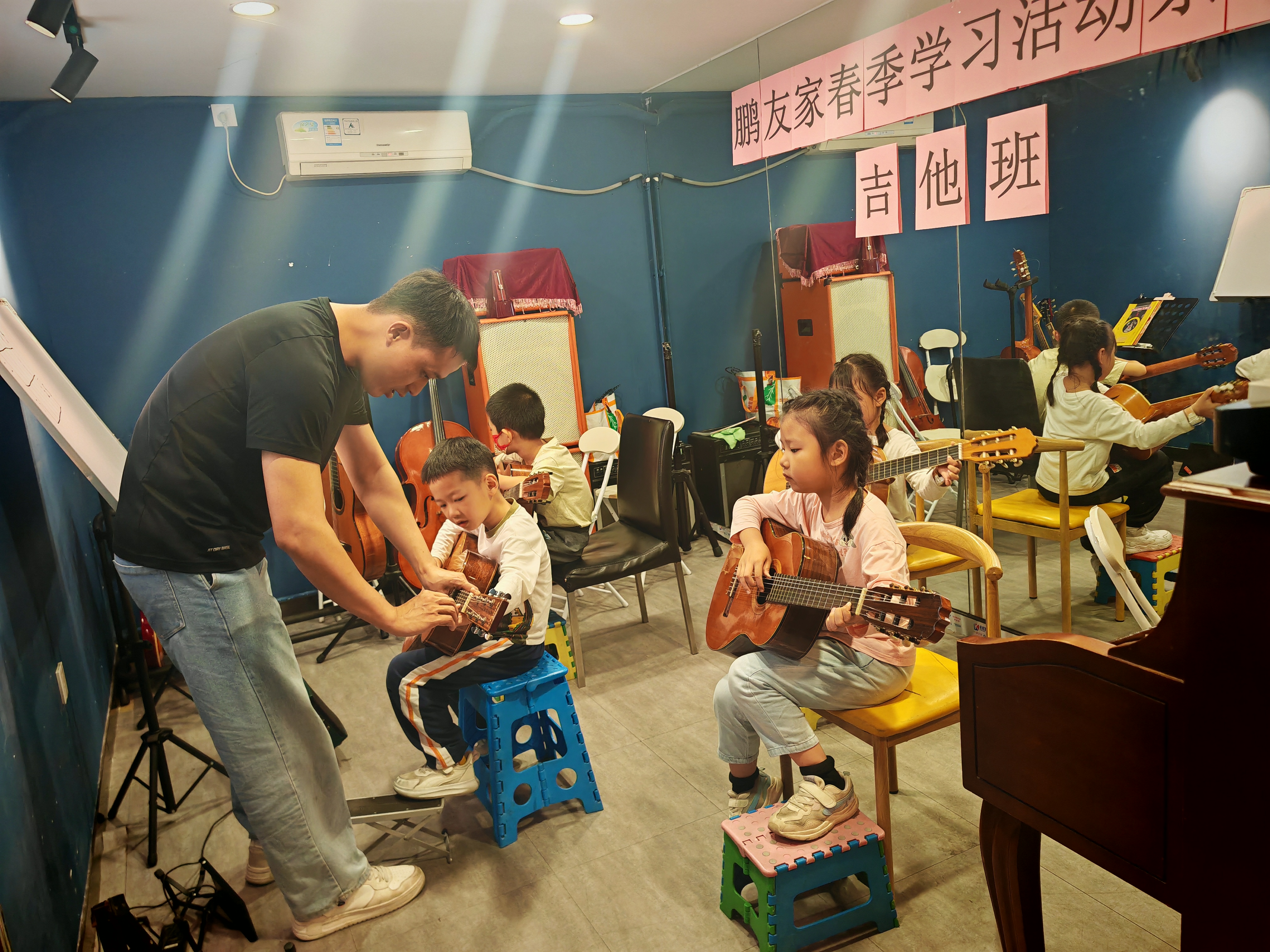 本次吉他公益班是“鹏”友家春季学习系列活动的一部分,该系列还涵盖国际象棋班、素描班等,内容丰富多样。吉他班特邀“李延音乐教育”机构的资深老师免费授课,从持琴姿势、基础乐理到简单和弦弹奏,手把手教学,零基础学员也能快速上手。课程还融入流行曲目练习、小组合作演奏等环节,让孩子在轻松氛围中提升专注力与团队协作能力。