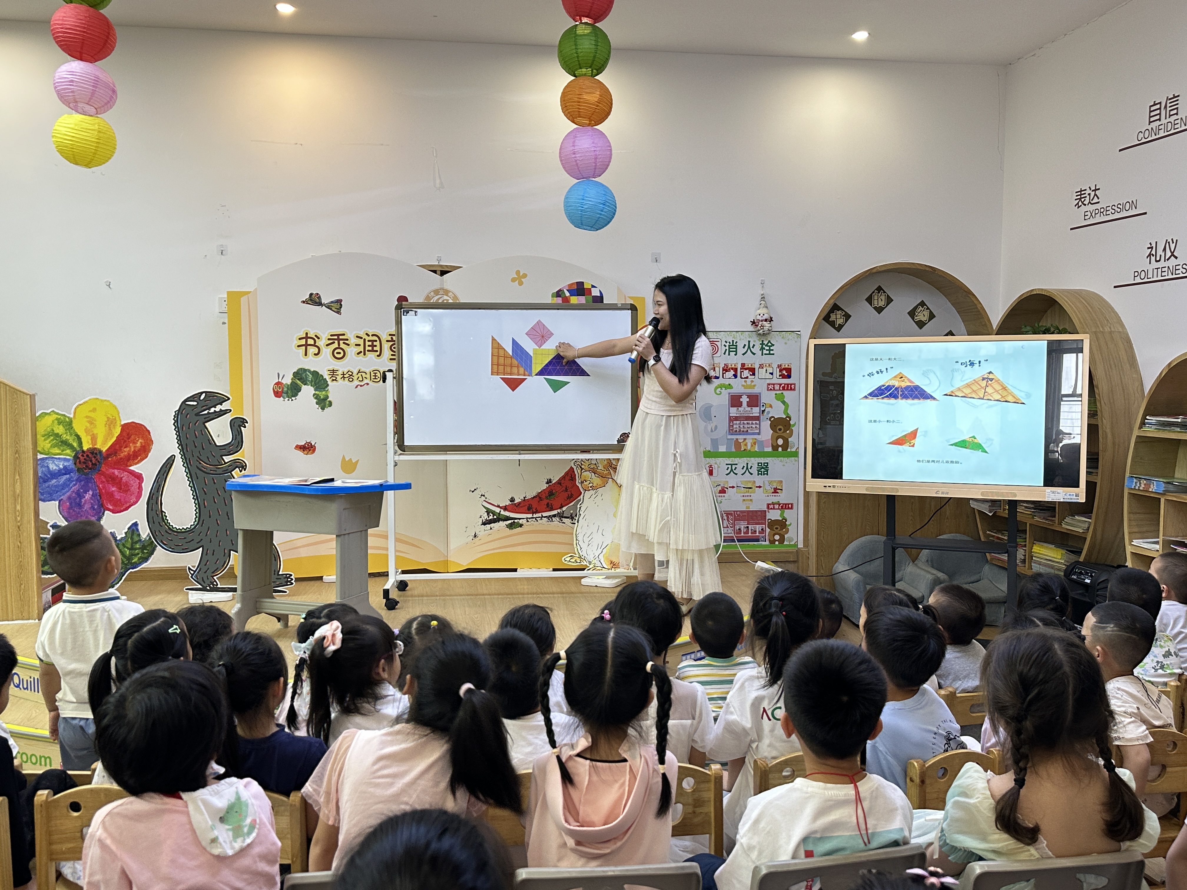 主题分享环节精彩纷呈。米拉母女默契演绎《早起的一天》,将书中清晨时光鲜活呈现;《七个好朋友》故事掀起活动小高潮,Mia妈妈的魔法诵读表演最是惊艳,她用感染力十足的声线和惟妙惟肖的角色模仿,配合七巧板道具的灵活运用带孩子们穿越绘本奇幻世界。压轴出场的小承贤和姐姐分享《加油!别放弃》,姐弟俩热情讲述与互动,引发全场共鸣,随后的知识问答环节更是童声鼎沸,孩子们踊跃抢答的热情充满整个会场。
