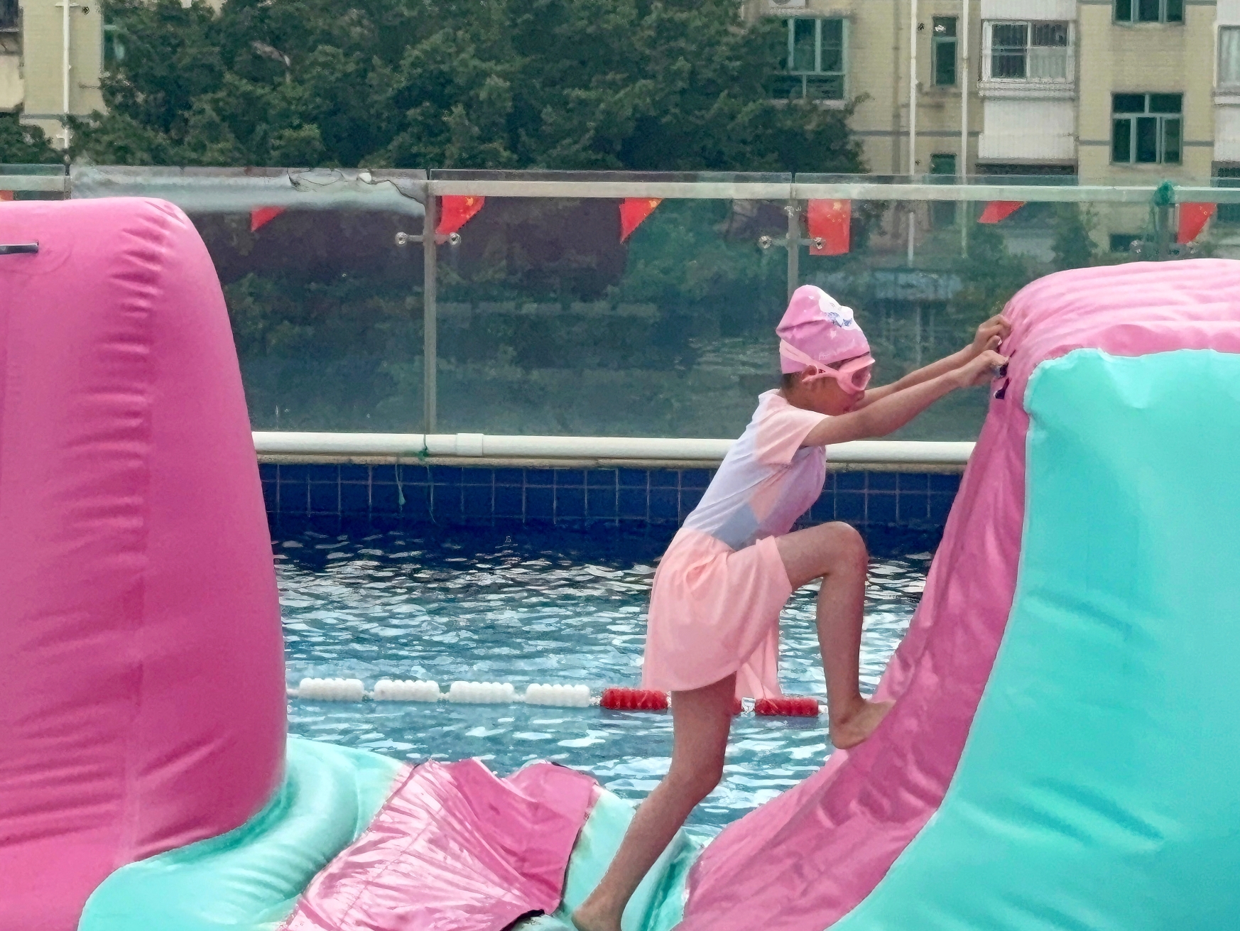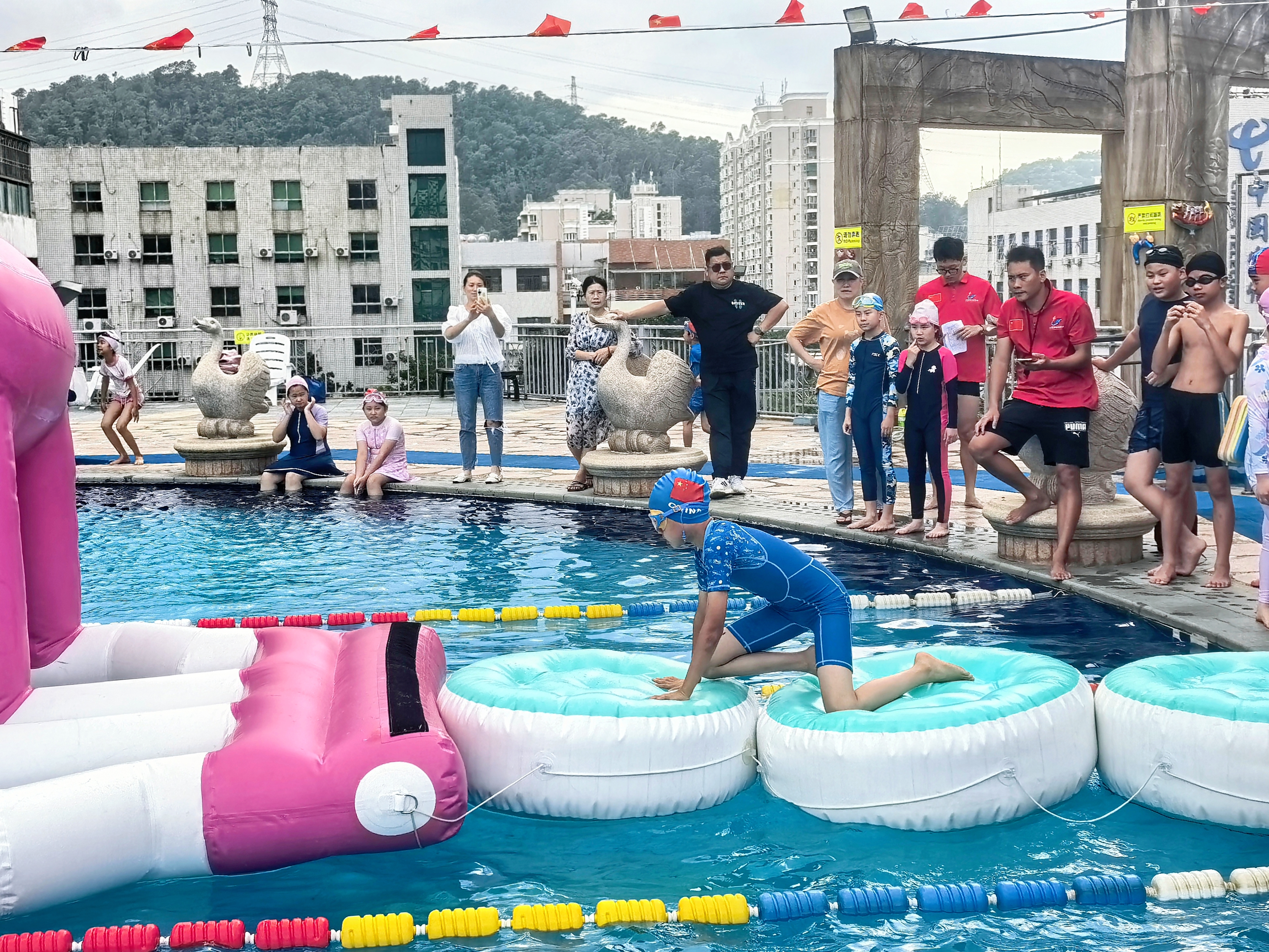 随后,备受期待的“逐浪闯关”——水上城堡挑战赛将节日气氛推向高潮。五彩斑斓的水上城堡宛如一座欢乐的童话世界,孩子们戴着泳帽、穿着泳衣,在家长的陪伴下,迫不及待地投入到闯关挑战中。小小的身影在设施间穿梭,奋力攀爬,纵身跳跃,顺流滑行,在清凉的水中尽情嬉戏;欢笑声、加油声此起彼伏,现场洋溢着欢乐的夏日气息。“孩子不仅学到了防溺水知识,还玩得特别开心,这样的活动太有意义了!”家长王女士对活动赞不绝口。