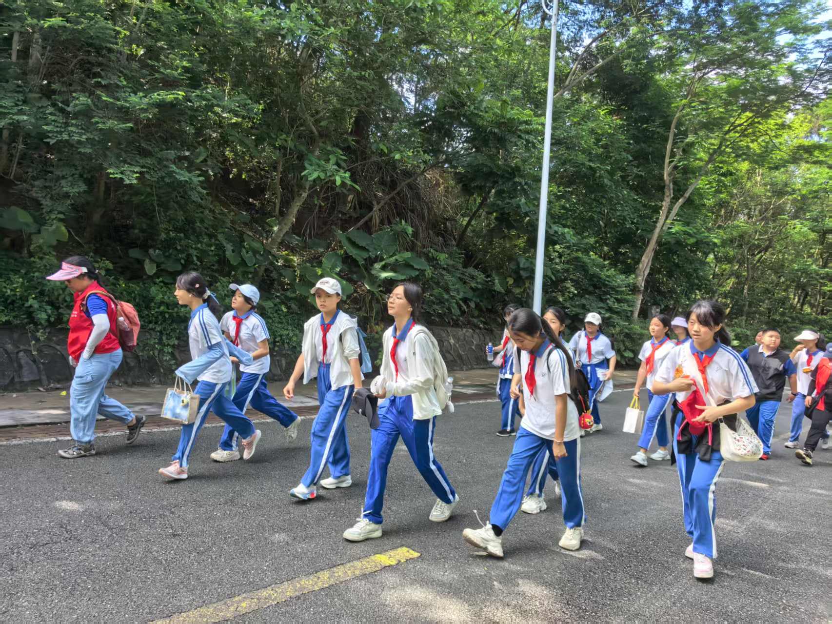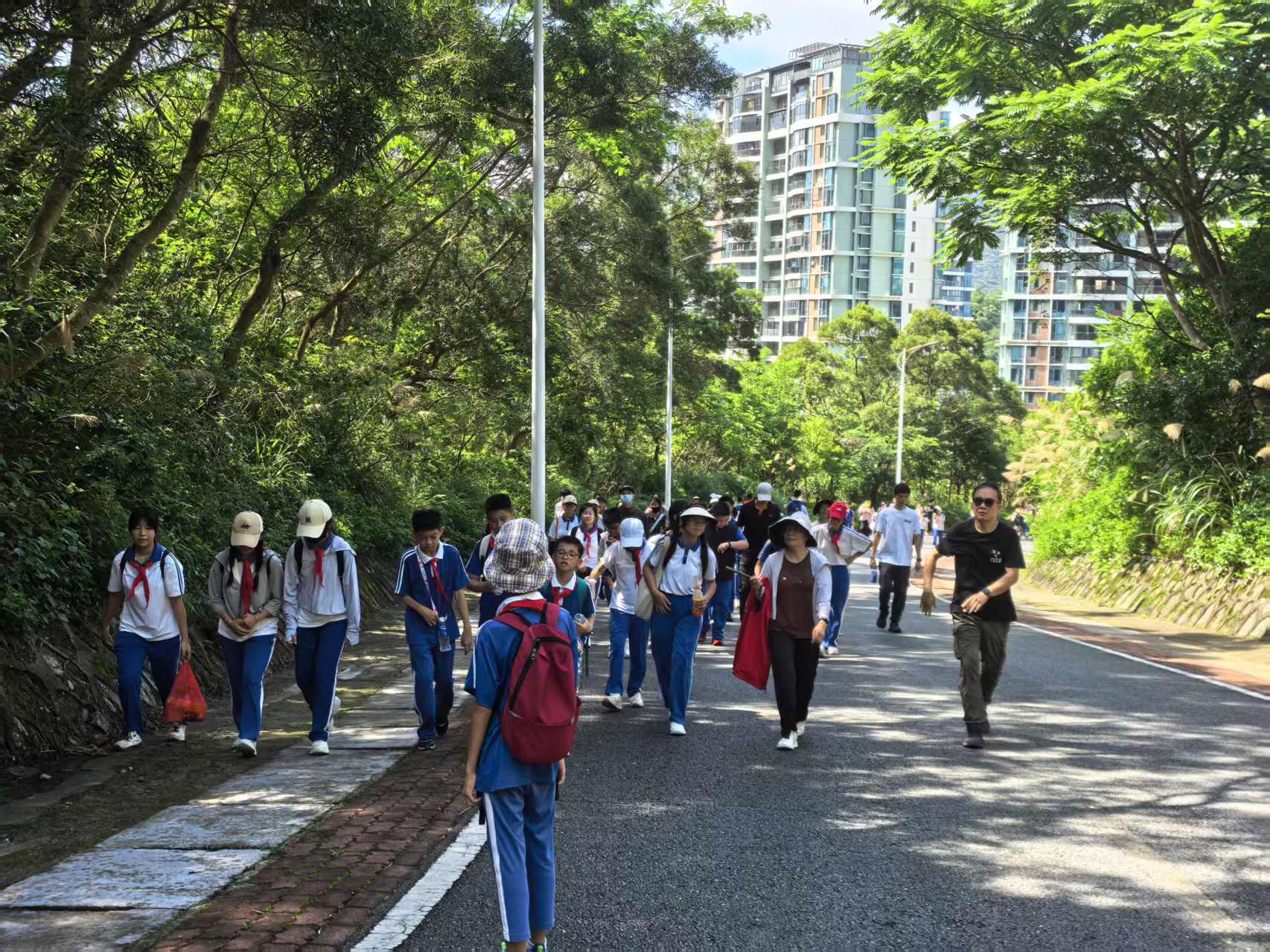 长达12公里的核心徒步路段充满挑战,但同学们以小组为单位,用实际行动诠释着团结协作的力量。遇到体力不支的伙伴,大家主动搀扶;物资短缺时,彼此无私分享。活动全程得到社区工作人员、罗湖中医院医护人员的随行保障——定时补充矿泉水,备齐防暑药品,全方位守护学生安全。随行的教师和家长义工时刻关注学生状态,灵活调整行进节奏,确保每位同学都能顺利完成挑战。“看到孩子们主动帮同学背书包,在陡坡处手拉手互相扶持,这才是最生动的成长教育。”参与保障的家长义工邓女士感慨地说。