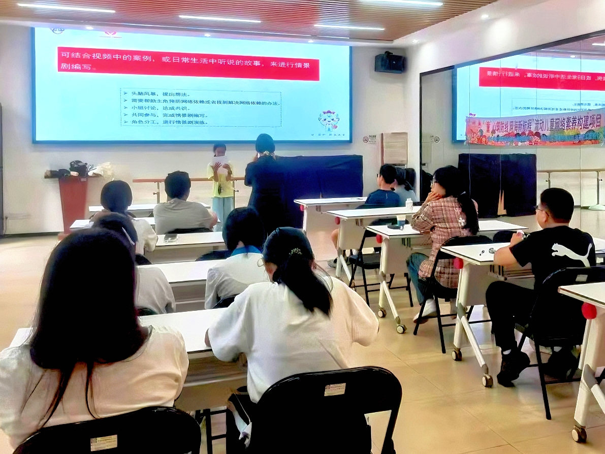 来到最令人期待的情景剧创作环节。孩子们自由分组,以真实的视频案例或身边听闻的“沉迷网络”故事为蓝本,发挥想象力改编剧情。其中,“小明因沉迷游戏忘记写作业,最终在朋友提醒下制定用网计划”是各小组聚焦的故事之一。孩子们通过头脑风暴,提出不同的想法为沉迷网络的小明提出各种预防网络依赖的解决办法;在协作过程中,他们对“如何做网络主人”这一核心问题的思考也更加深入。