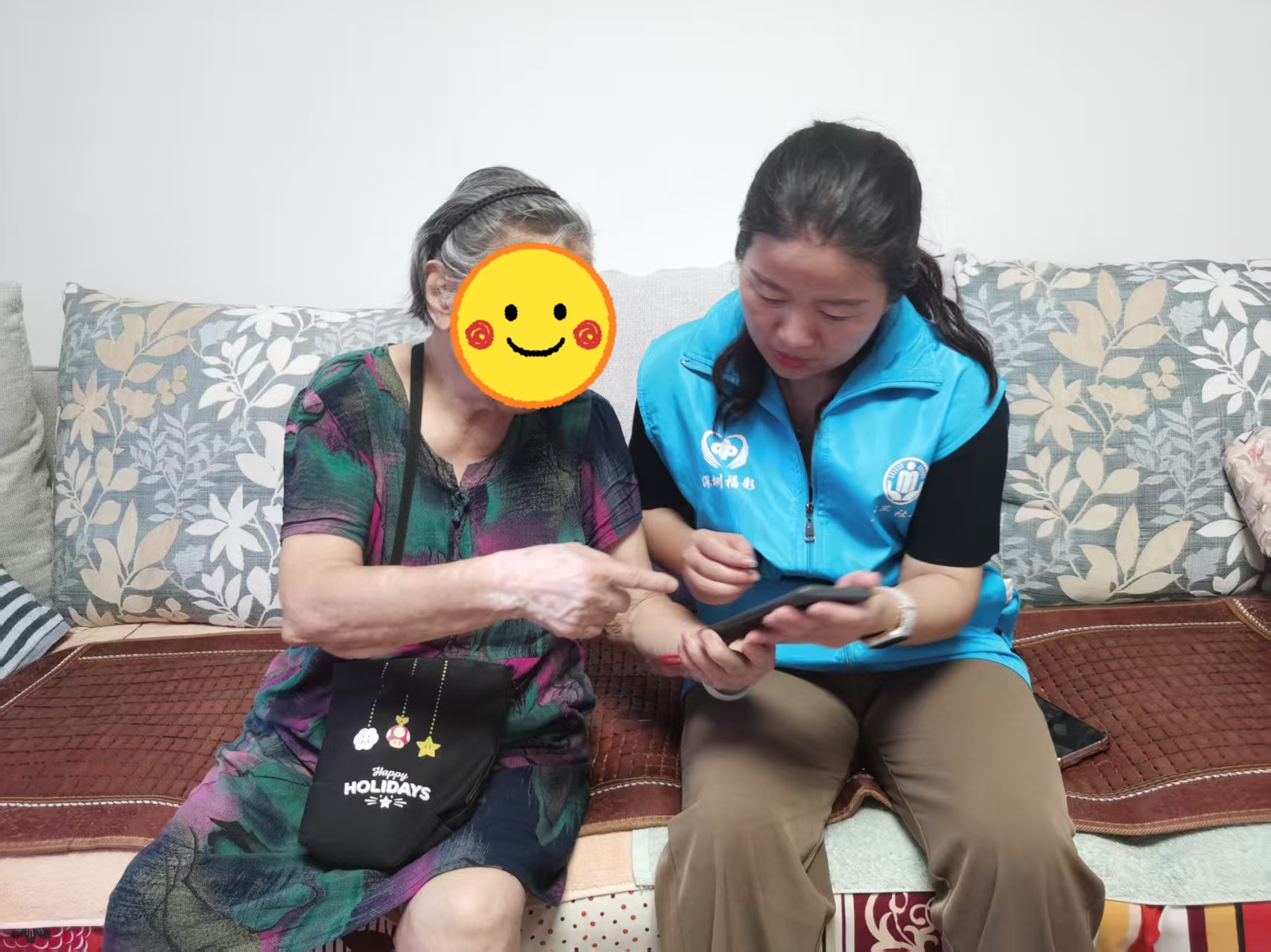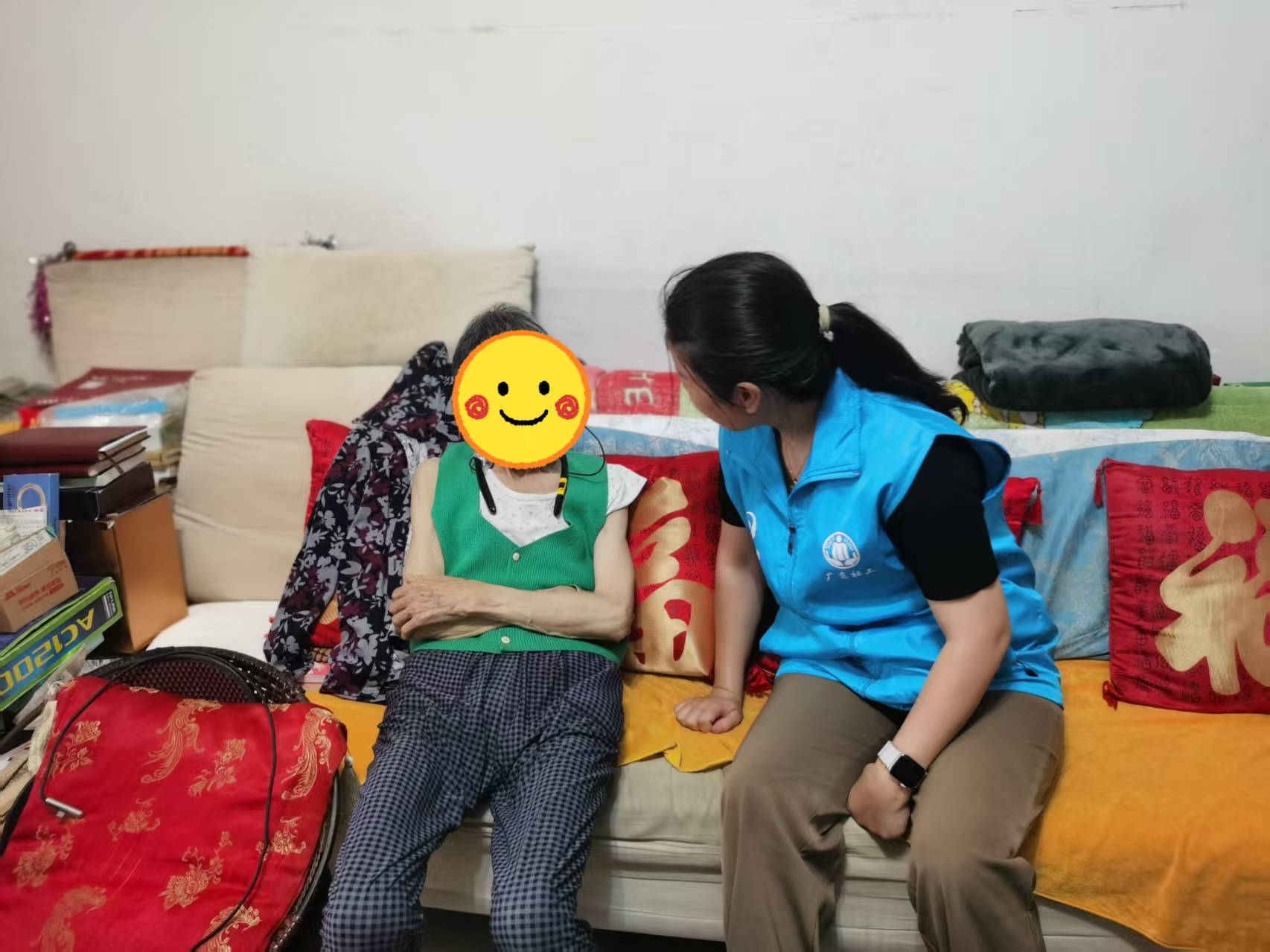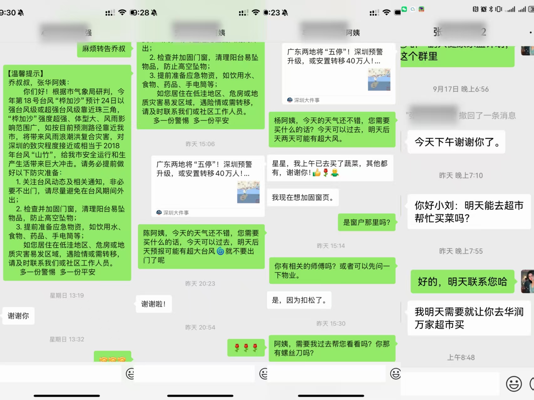 宣传引导到位,增强防范意识。社区通过居民微信群、公告栏等渠道,及时发布台风预警信息和《防台风安全提示》。针对独居老人和困难家庭,工作人员挨家挨户上门告知避险知识、应急避难场所位置及联系方式等,提醒居民减少外出、妥善安置阳台易受风吹落的物品。独居阿姨杨阿姨感动地说:"太感谢你们了!这次台风多亏你们一直惦记着我!又是帮忙检查门窗,又是送来应急物资,还反复叮嘱我注意安全。你们就像我的孩子一样贴心,让我心里暖暖的。有你们在,我什么都不怕!"