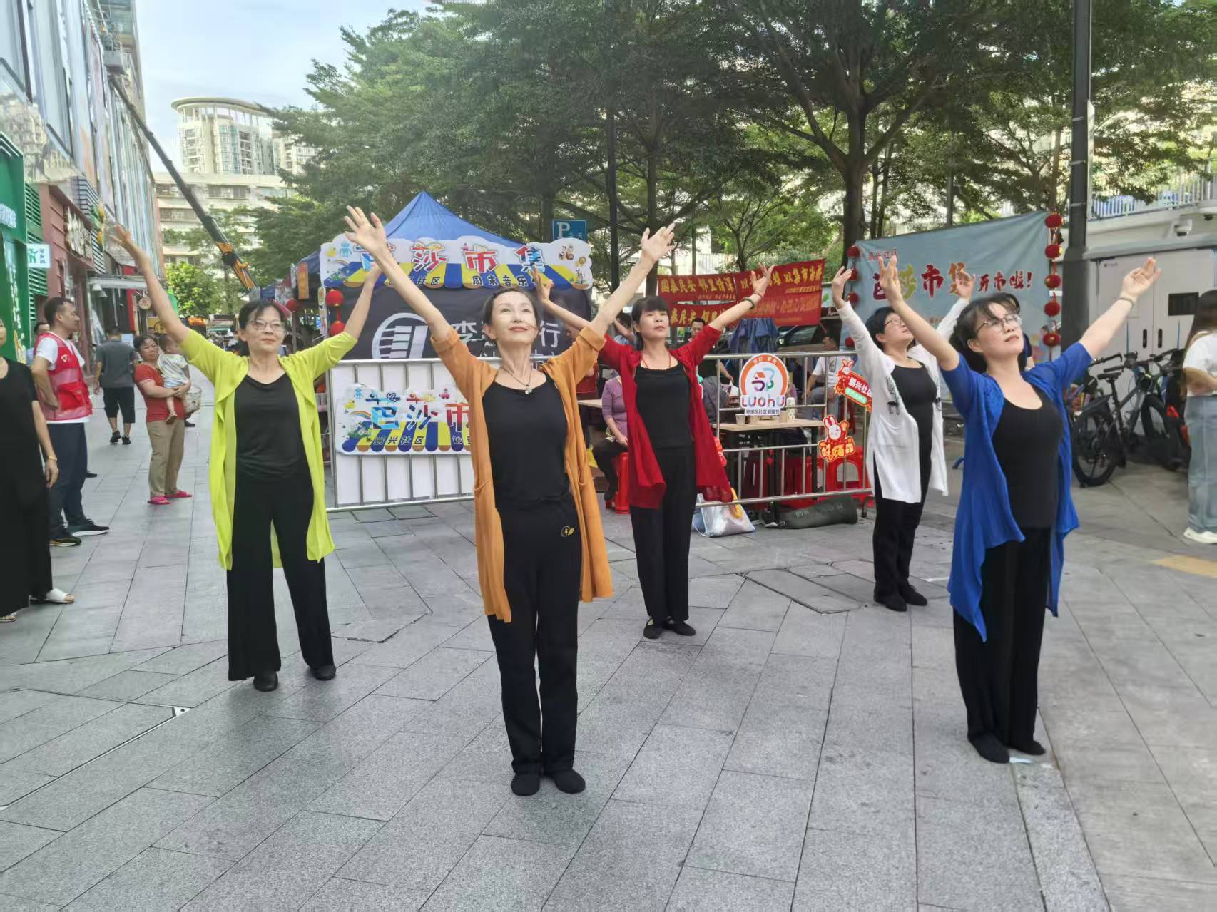 随着音乐响起,“露天Live”正式拉开帷幕。由社区李延音乐机构组成的乐队轮番登场,流行金曲、经典老歌与民谣小调交替上演。熟悉的旋律引发了围观居民的大合唱,大家挥舞着手,跟着节奏轻轻摇摆,气氛持续升温。一位刚放学的孩子勇敢地接过话筒,献唱《歌唱祖国》。她稚嫩却清澈的歌声引起了全场共鸣,众人纷纷加入合唱,赢得满堂喝彩。歌声与掌声此起彼伏,将现场气氛推向了一个又一个高潮。随后登场的社区公益舞蹈队同样耀眼,五位精神饱满的舞者身着统一黑色练功服,搭配亮色开衫,在烟火气十足的市集背景前舞动《我和我的祖国》,动作整齐,神情专注,成为一道流动的风景线,吸引往来居民纷纷驻足。