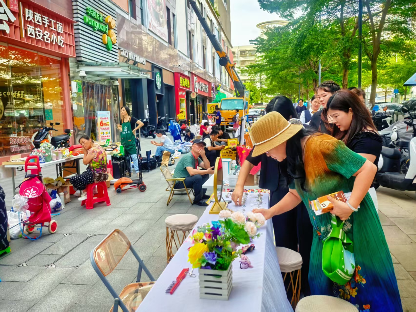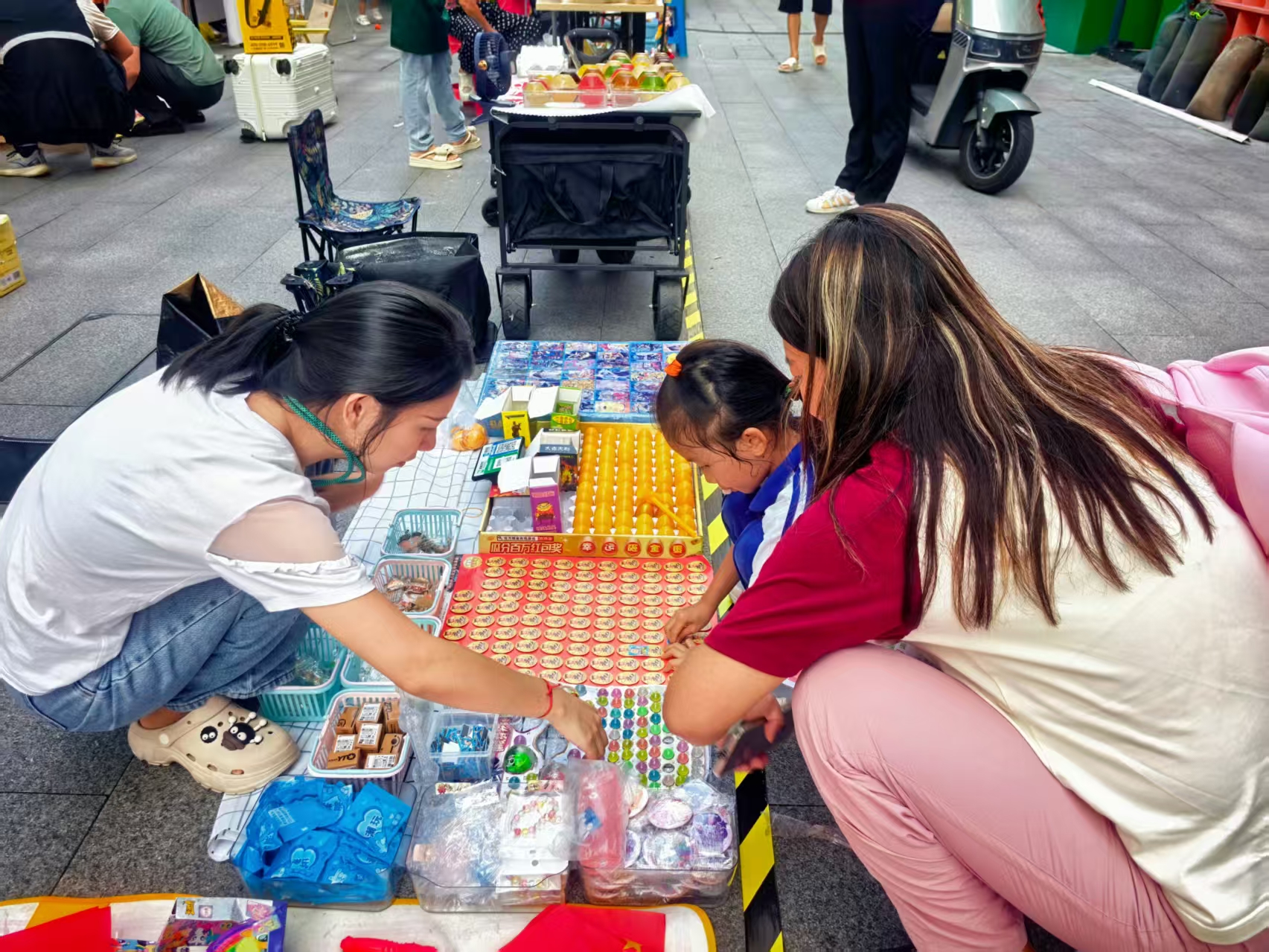 公益集市更是“宝藏”聚集地。十来个摊位一字排开,有卖手工饰品的,有卖儿童绘本的,还有居民出售家里闲置的玩具、小家电,价格十分实惠。薛阿姨就在一个摊位前淘到了漂亮的小台灯,她笑着说:“花小钱办大事,真开心!”