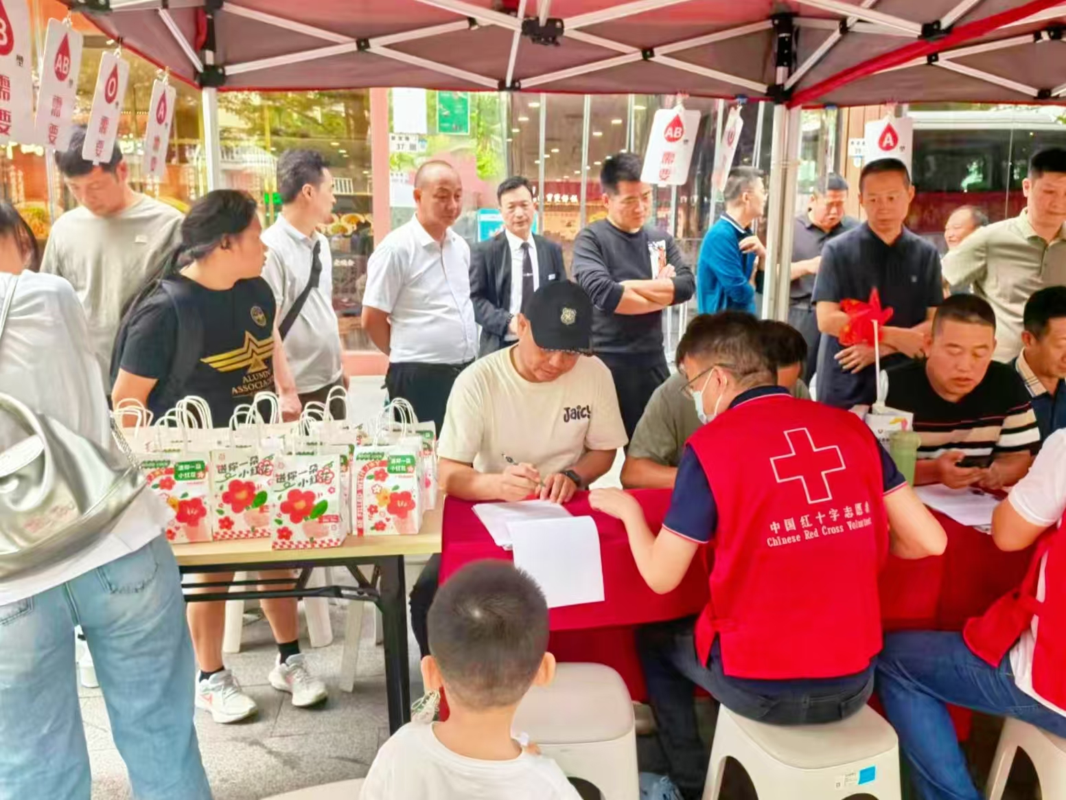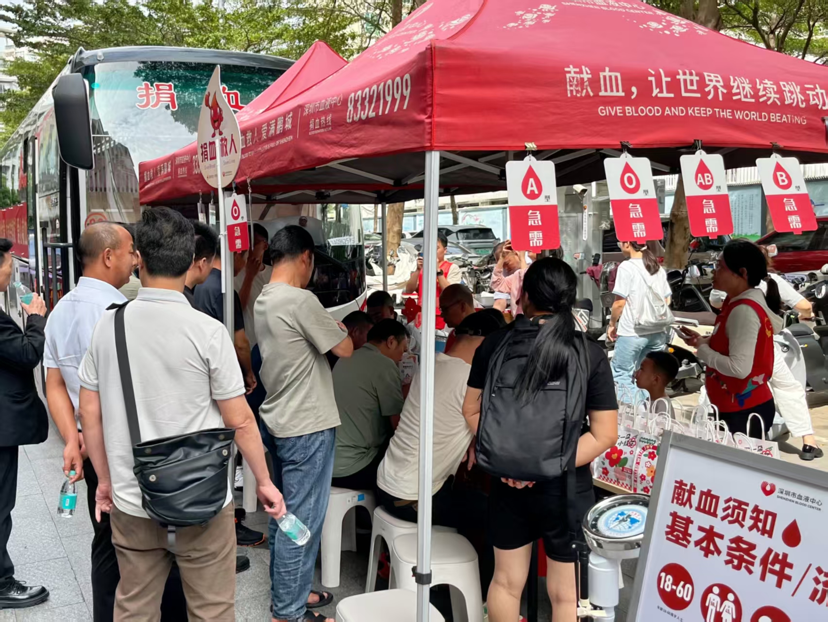 活动现场,深业运营集团园区物业事业群的工作人员已开始了暖心布置。搭设遮阳棚、摆放座椅……各项准备工作井然有序。他们还特意备好了丰富的“爱心能量包”,以便献血者结束后能第一时间补充能量、舒缓疲惫,这份无微不至的关怀,让爱心之举倍感温暖。党员王先生是第一个报名的,从填写信息、测量血压到查验血型,每一步都格外认真:“作为党员,这种时候肯定要冲在前头,能给需要的人多一份保障,值!”路过的参加献血的一位居民感叹:太贴心啦,能做家门口就完成献血,让更多的人参与这份大爱活动。