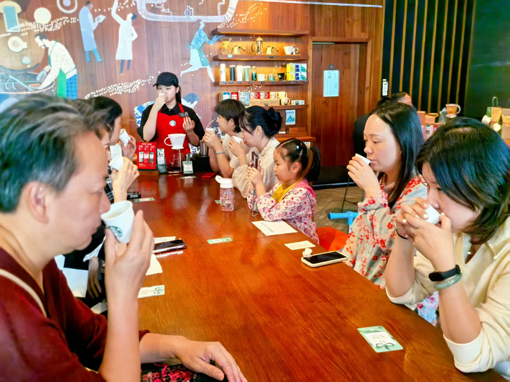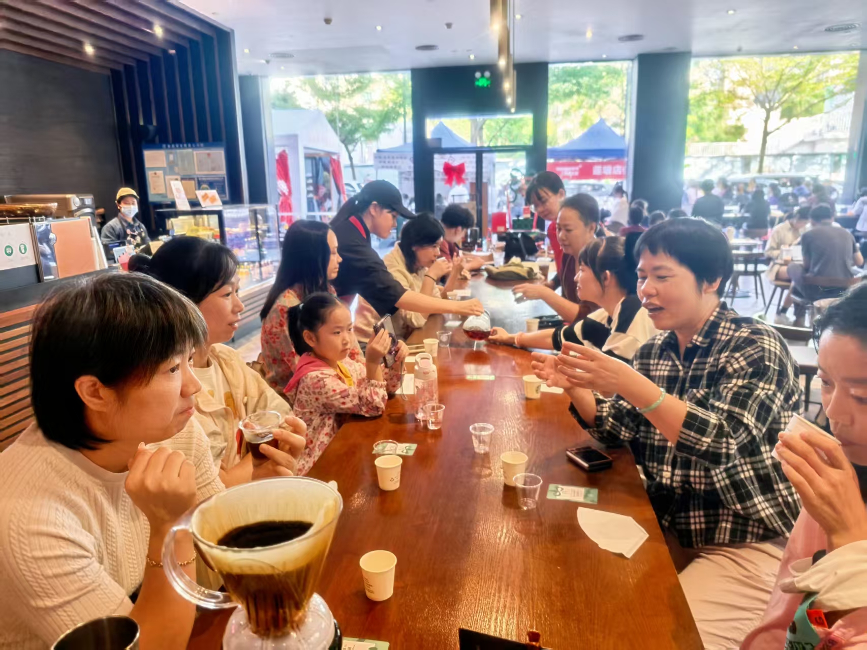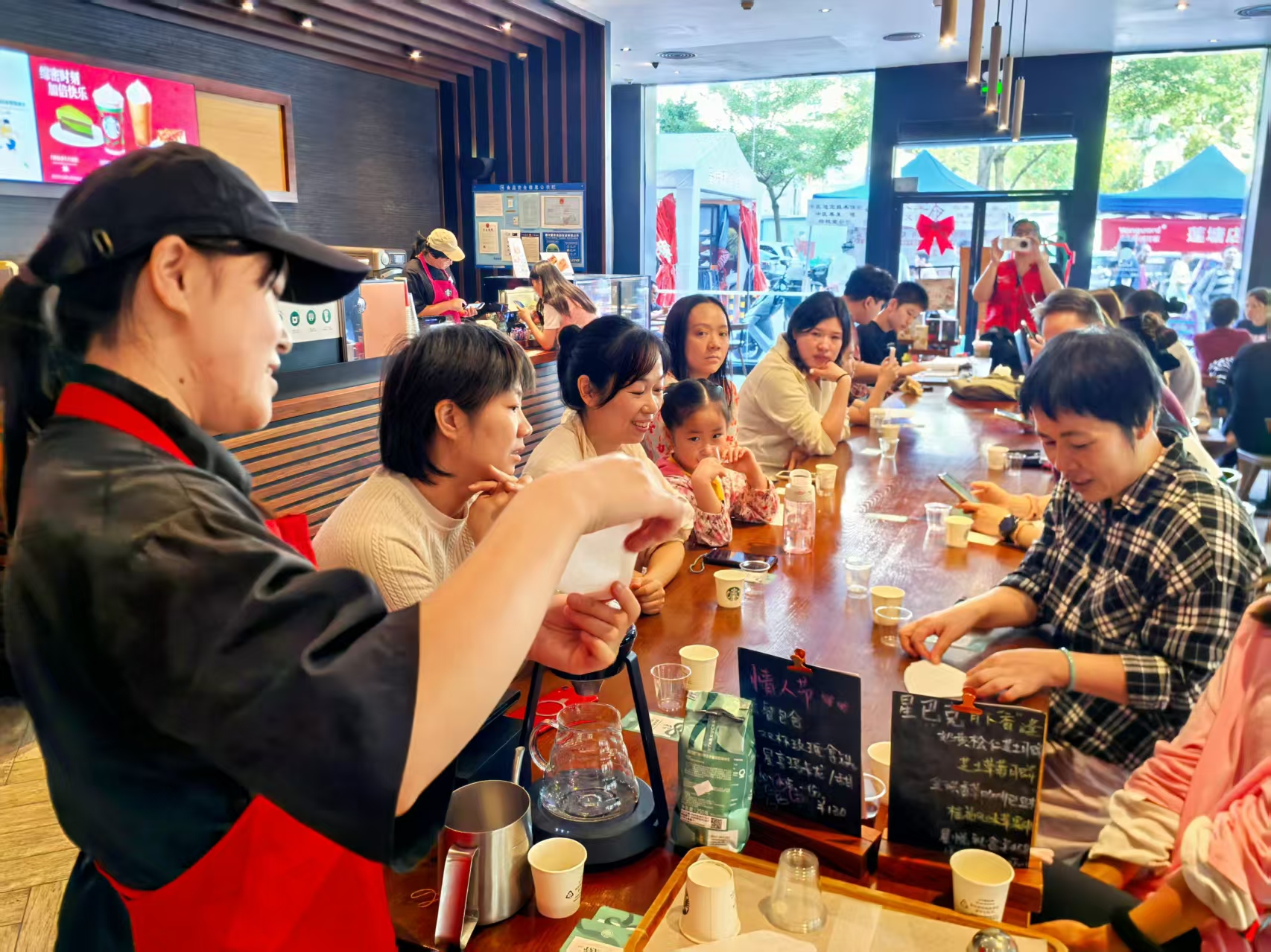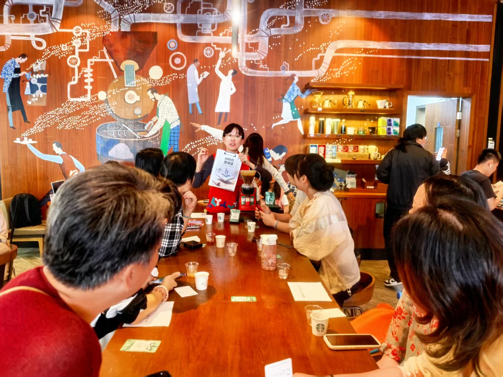 星巴克的咖啡师一步步演示了手冲咖啡的全过程,从挑豆子、磨粉,到控制水温、注水手法。大家看得认真,不时低声交流。有人专注地盯着水流,小心翼翼地画着圈;有人凑近闻着咖啡香气,惊喜地交流着不同手法带来的风味变化。王女士边观摩边感慨:“冲咖啡就像读书,急不得,慢下来才能品出味道。”