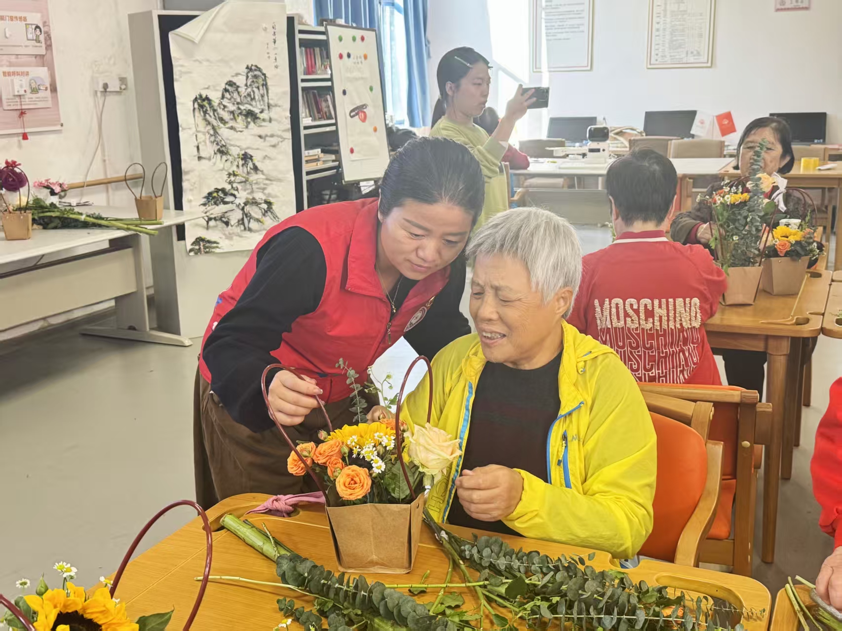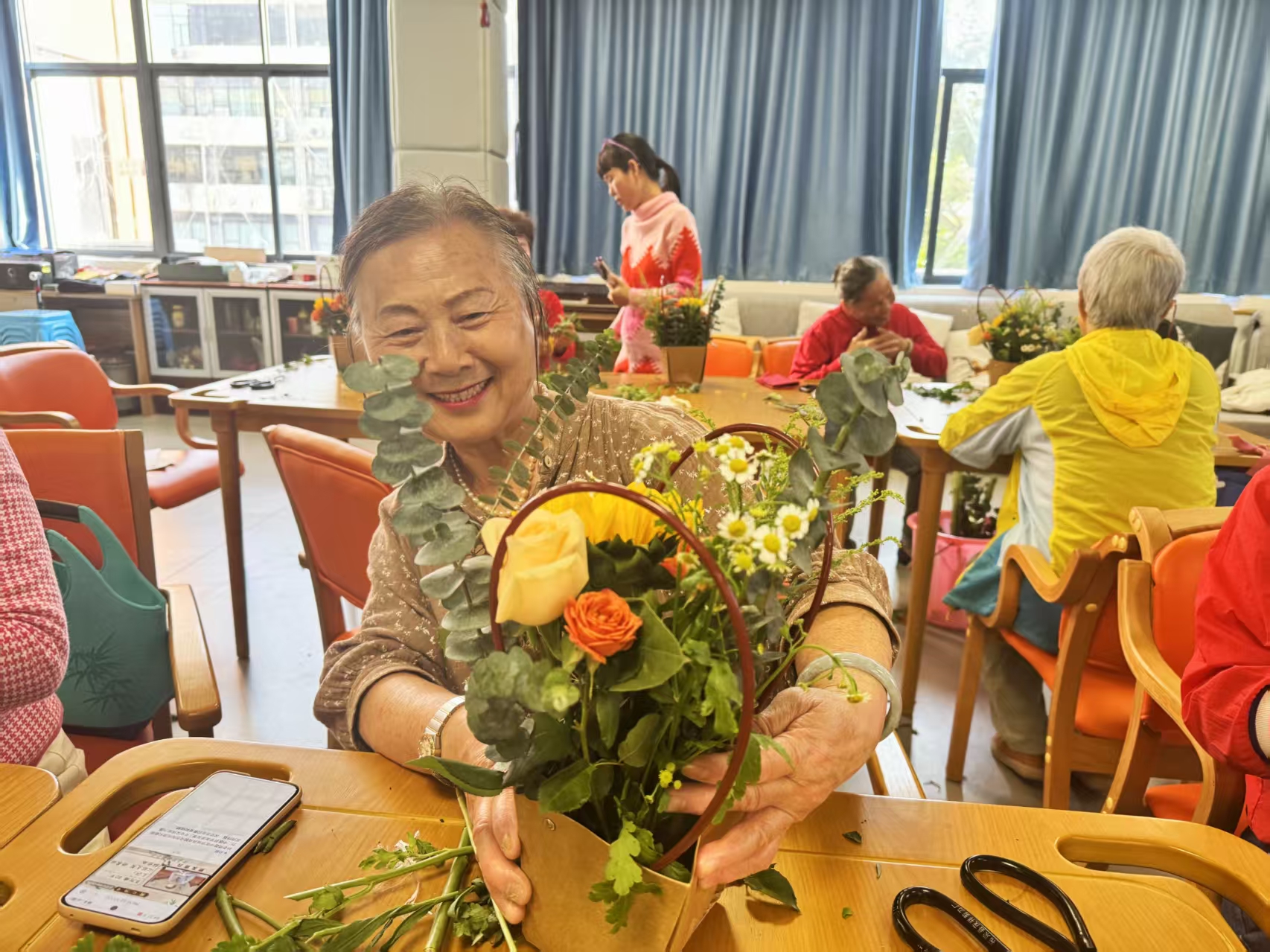 经过一番精心创作,一件件错落有致的插花作品在长者们的手中完成。每一件作品都蕴含着长者们对生活的热爱和对美的追求,有的清新淡雅,有的热闹饱满,各具特色。看着自己亲手完成的作品,大家脸上都露出欣喜的笑容,不时举起花束互相欣赏、称赞。