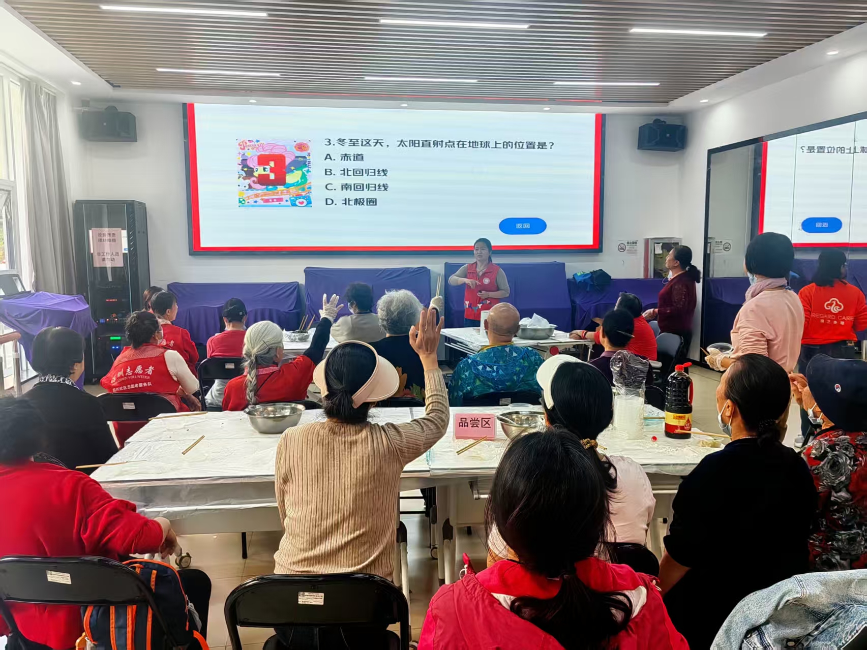 在等待饺子煮熟的间隙,社工围绕冬至民俗、邻里美德等内容组织了轻松有趣的知识问答。长者们踊跃抢答,在互动中深化了对传统文化的理解,也重温了睦邻友好的价值共识。每当有人答对题目,现场就会响起热烈的掌声,答对的长者也会开心地领取到一份精美的小礼品。