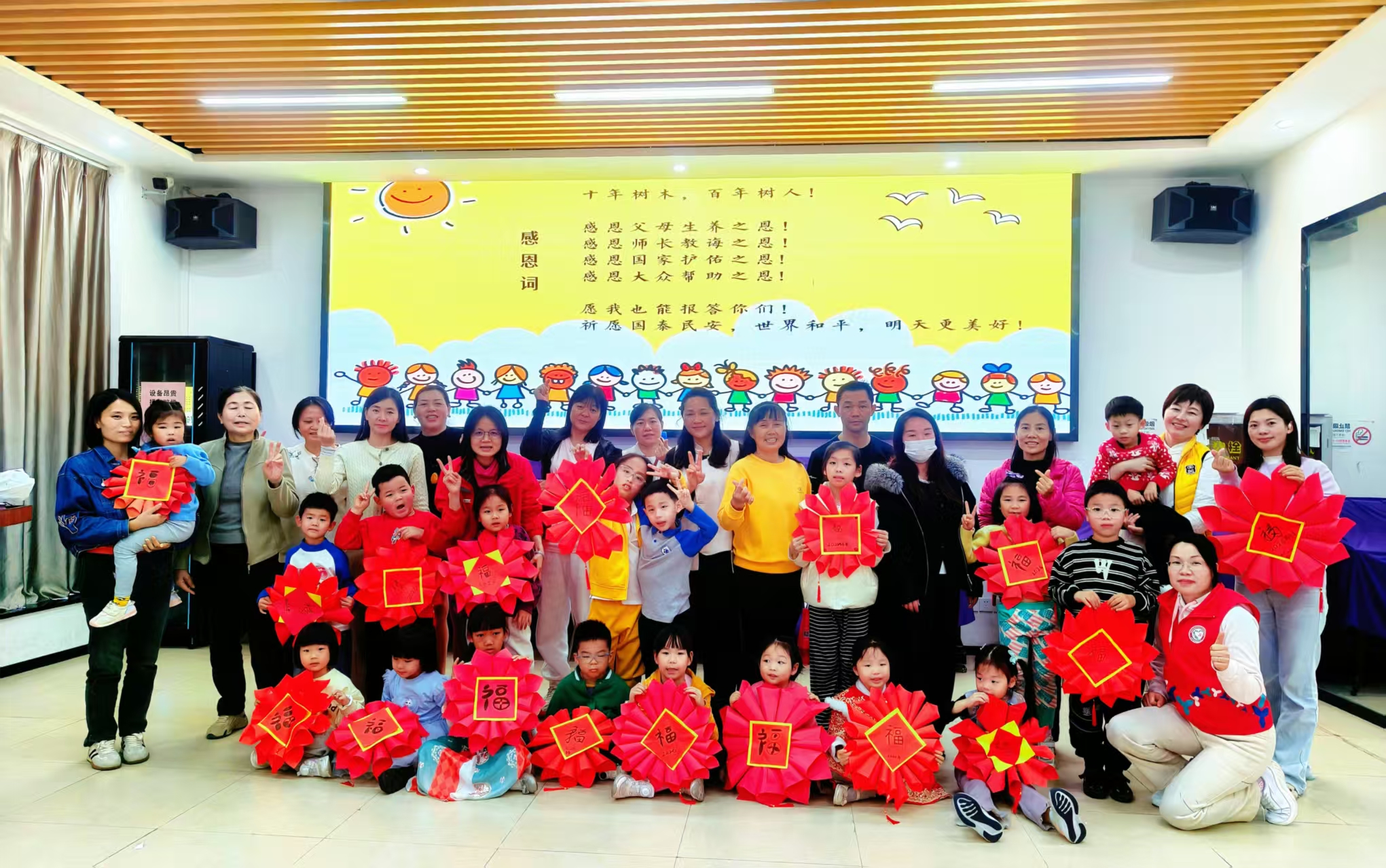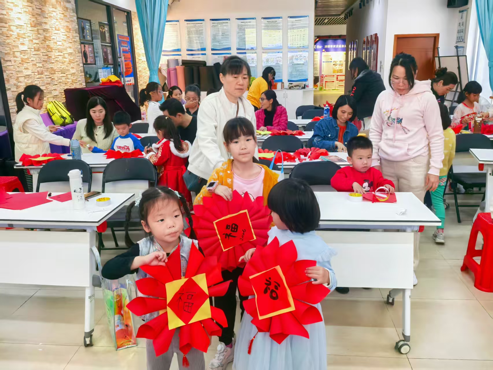 活动最后,每个人都展示了自己制作的福字挂饰。有的家庭指着孩子画的图案向旁人介绍,有的父母举起福字与孩子合影留念,也有亲子击掌庆祝合作完成。大家互相欣赏、交流做法,活动室里洋溢着轻松愉快的笑声。