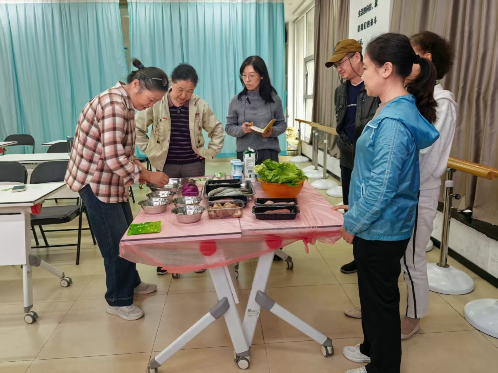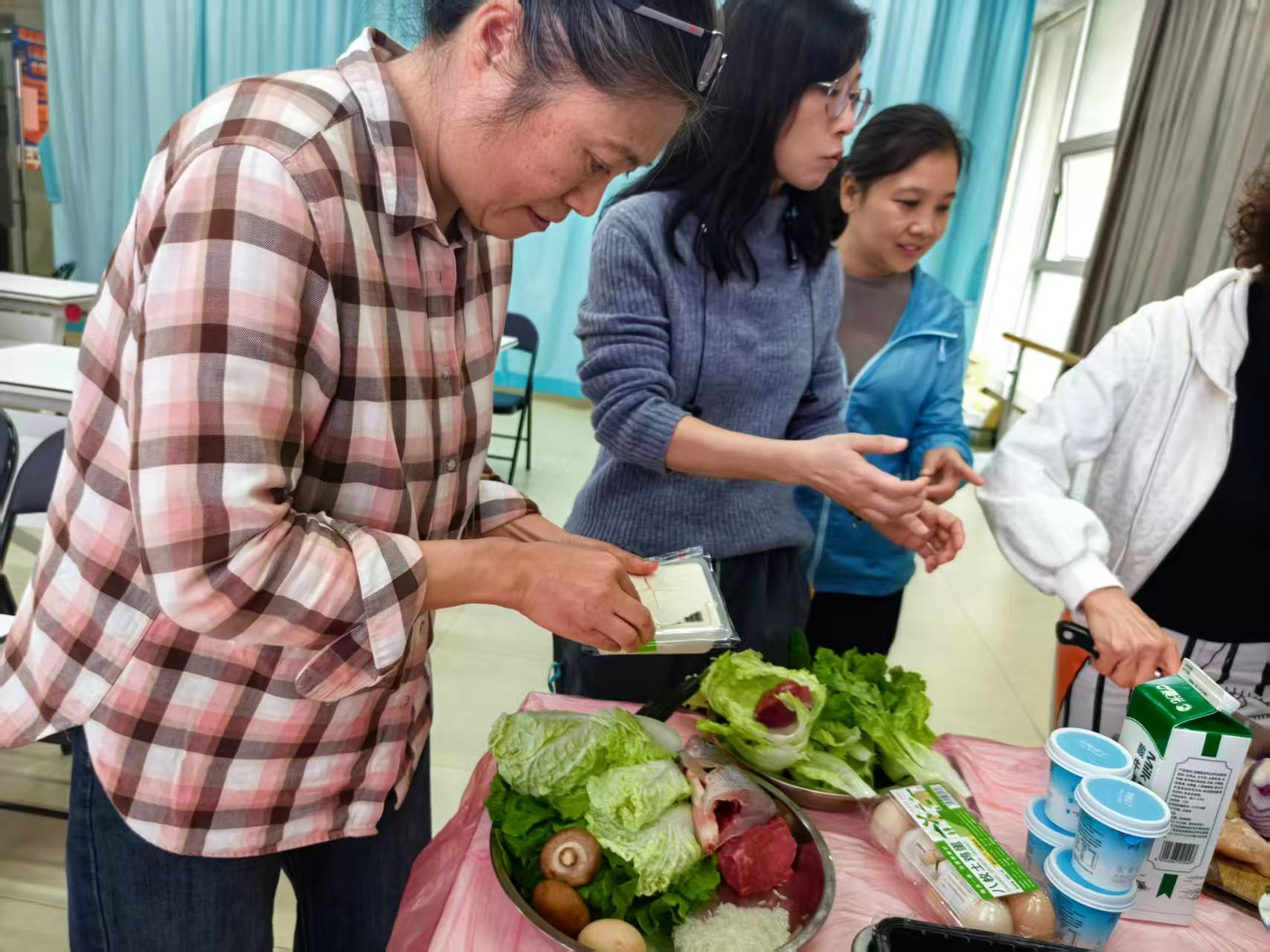 李老师结合元旦餐桌的常见搭配需求,逐一讲解各类食材的营养价值,比如鸡胸肉和瘦牛肉的优质蛋白含量、鲈鱼的不饱和脂肪酸优势,以及蔬菜和菌菇类的膳食纤维与维生素作用。随后,她以“节日营养平衡餐盘”为目标,现场演示食材搭配比例:建议居民在元旦聚餐时,可按照“优质蛋白占二分之一、蔬菜占四分之一、主食占四分之一”的比例搭配餐盘。她以现场的食材举例,例如用200克鸡胸肉,搭配等量的生菜、黄瓜,再加一份适量的杂粮主食,即可组成一份营养均衡的节日餐食。老师还提醒居民,节日期间可适当增加牛奶、酸奶的摄入,补充钙质与益生菌,帮助维持肠道健康。同时,她也积极倡导“光盘行动”,建议居民根据用餐人数适量准备食材,践行节约,避免节日餐饮浪费。