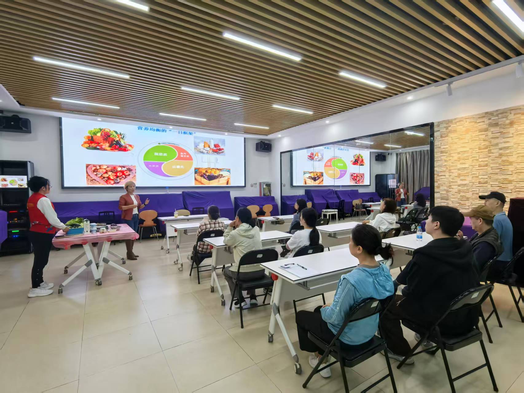实操搭配演示环节是本次活动的重点环节。老师现场展示了精心准备的各类食材,其中有肉类,如:鸡胸肉、鲈鱼、瘦猪肉、瘦牛肉;蔬菜及豆制品,如:豆腐、香菇、黑木耳、生菜、洋葱、黄瓜、小白菜;此外还有鸡蛋、牛奶、酸奶等。