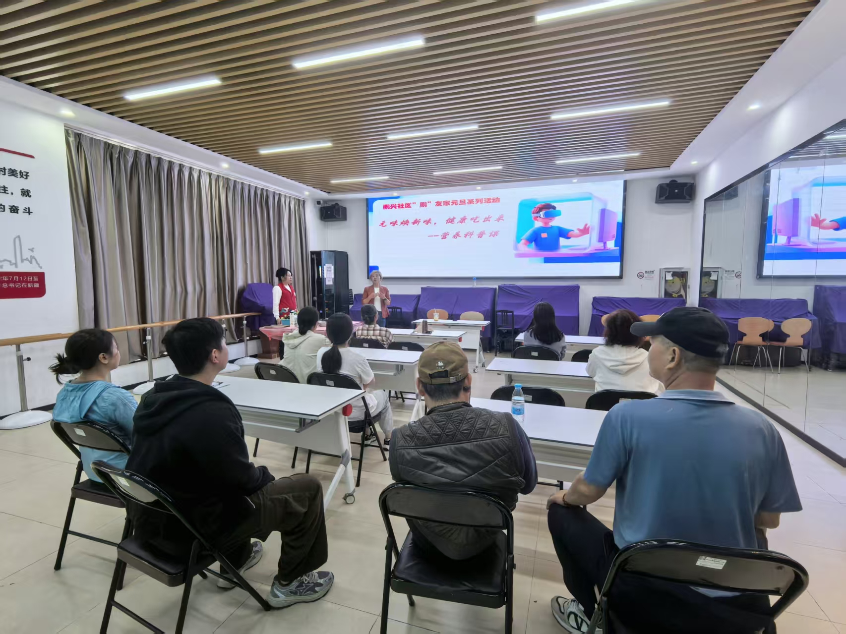 居民们边听边记,在互动环节,大家结合自家情况踊跃提问:“李老师,家里老人总说年夜饭必须有整鱼整鸡,肉菜一大桌才叫过节,这种观念怎么调和呢?”、“如果聚餐时实在吃不完,哪些菜不适合反复加热?”、“有三高情况的话,您说的优质蛋白是不是要更严格控制分量?”……一一结合实例给予解答,既肯定传统习俗的寓意,也提供“形式不减、做法可调”的改良思路。大家纷纷表示,这次科普课实用性极强,不仅学到了营养搭配知识,也能应用于元旦家宴,让佳节过得更健康。