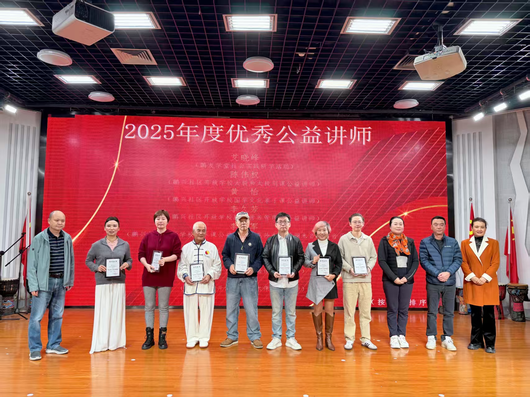 回望2025,鹏兴社区深耕基层治理,以四方联动凝聚共治合力,让优质资源扎根社区、普惠民生。活动现场,五大表彰环节熠熠生辉,见证着责任与担当的传递。11家“社区共建模范单位”践行社会责任,以物资、课程、实践基地等多元支持赋能社区发展;8名“优秀公益讲师”深耕文化传播,用专业课程丰富居民精神生活;11位“优秀志愿者”坚守岗位、主动担当,以点滴行动筑牢社区服务根基;“优秀志愿团队”凝心聚力、精益求精,展现高效协作的公益力量;“最美校长”深耕教育共建,架起家校社协同育人的坚实桥梁。每一份荣誉都闪耀着“奉献、友爱、互助、进步”的志愿精神,每一张笑脸都洋溢着对社区的深情与期许。