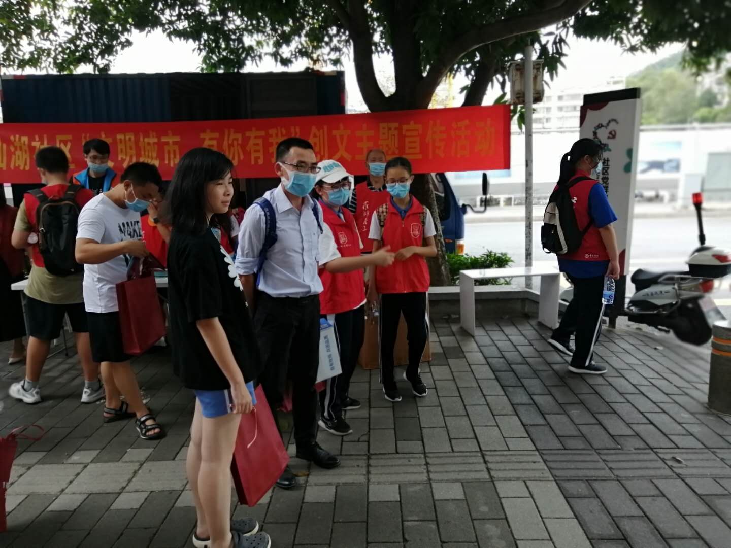2020年8月11日,仙湖社区工作站,仙湖社区党群服务中心开展助力创文行动,组织义工向辖区市民派发“携手同行 共建全国文明城市—致广大居民朋友的封信”以及“深圳市民文明手册”,旨在让辖区居民了解深圳正在创建全国文明城市工作的具体内容,邀请居民共同参与创文工作。