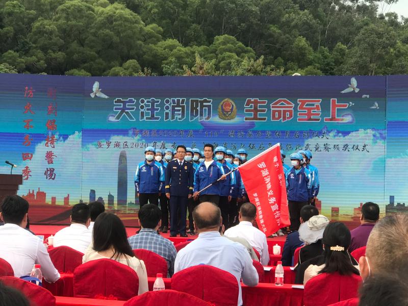 本次活动首先为2020年度专(兼)职消防队伍应急技能比武竞赛获奖者颁奖。获奖队伍一个个英姿飒爽,展示了罗湖区消防队伍的坚强力量和保护人民生命财产安全的强大决心。