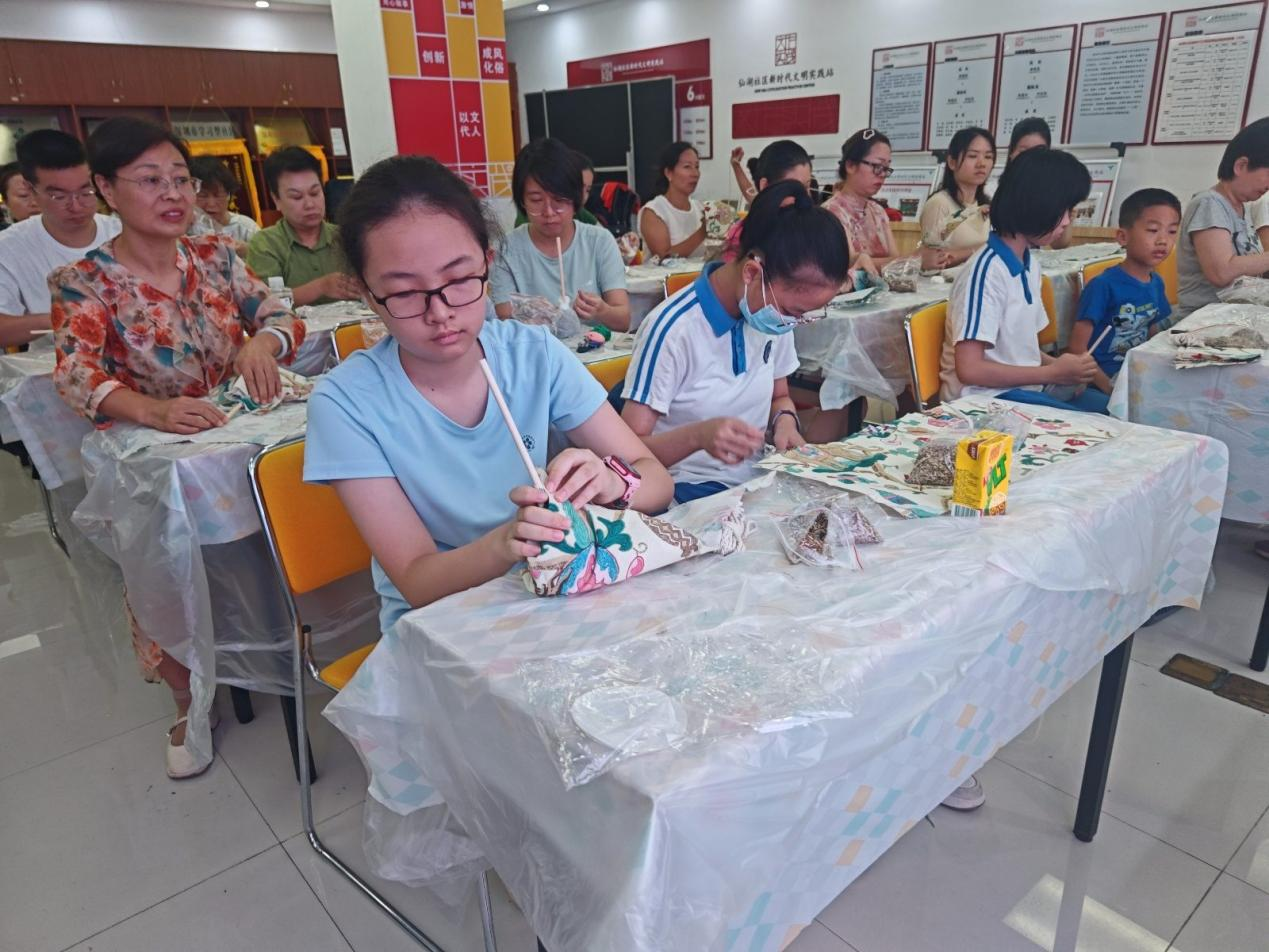 在工作人员的指导下,居民们纷纷动手制作起来。有的居民手法娴熟,迅速完成了艾草锤的捆绑与定型;有的居民则对中药香囊包的缝制格外用心,一针一线都凝聚着对健康生活的美好祈愿。大家相互交流、学习,现场欢声笑语不断,充满了温馨与欢乐。