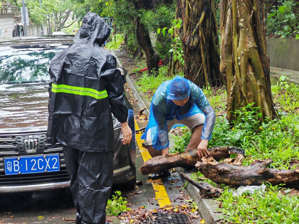 夜幕降临,社区工作人员无畏前行,开展夜查工作,重点对在建工地、高陡边坡、危房危墙、户外广告牌、低洼地等风险点开展巡查,确保隐患早发现、早处置,密切关注风情雨情汛情,加强排水设施巡查,防止内涝发生。面对倒伏的树木,他们不顾风雨,迅速投入清理工作,切割、搬运,及时“清障”,有效保障了居民出行安全及辖区道路畅通。