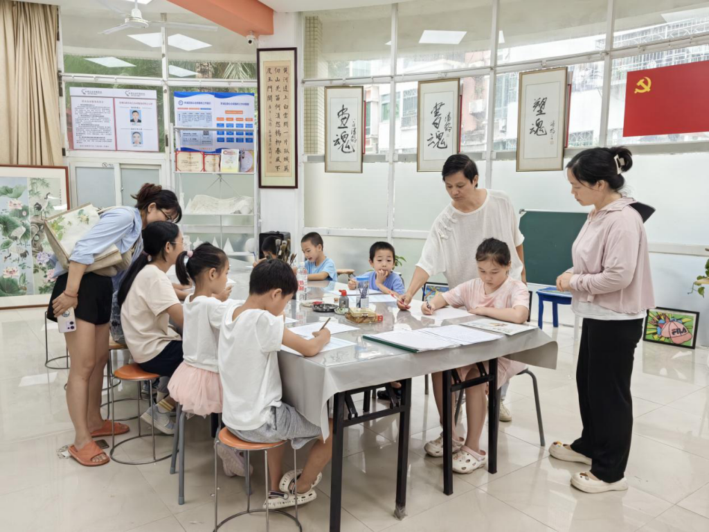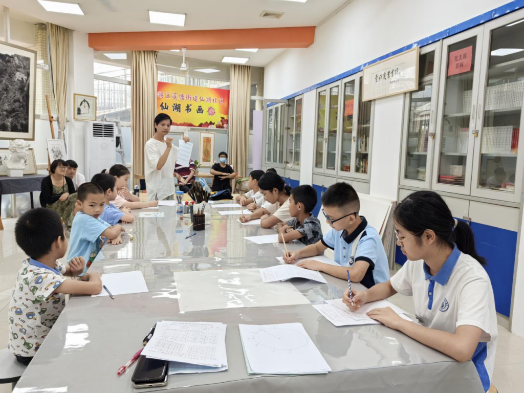 近日,仙湖社区携手壹佰度书画院,在梧桐山新居党支部党群服务站开展“规范化写字·规范双姿”暑期公益课,活动分上午和下午二场,共计30名6-14岁社区儿童及家长参与,由专业书法教师庄老师指导。