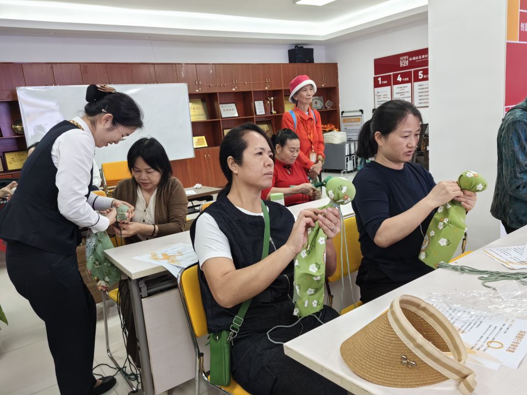 手工制作环节顿时让现场气氛活跃起来。长者们兴致盎然,亲手填充艾草与茱萸,细心地将布料包裹成紧实的锤状,再用棉线一圈圈缠绕、固定。活动现场清香弥漫,笑语盈盈。看着自己亲手完成的、充满心意的手作,陈阿姨爱不释手,高兴地说:“自己做的养生锤,又好看又实用,闻着艾草的香味,感觉特别安心!”