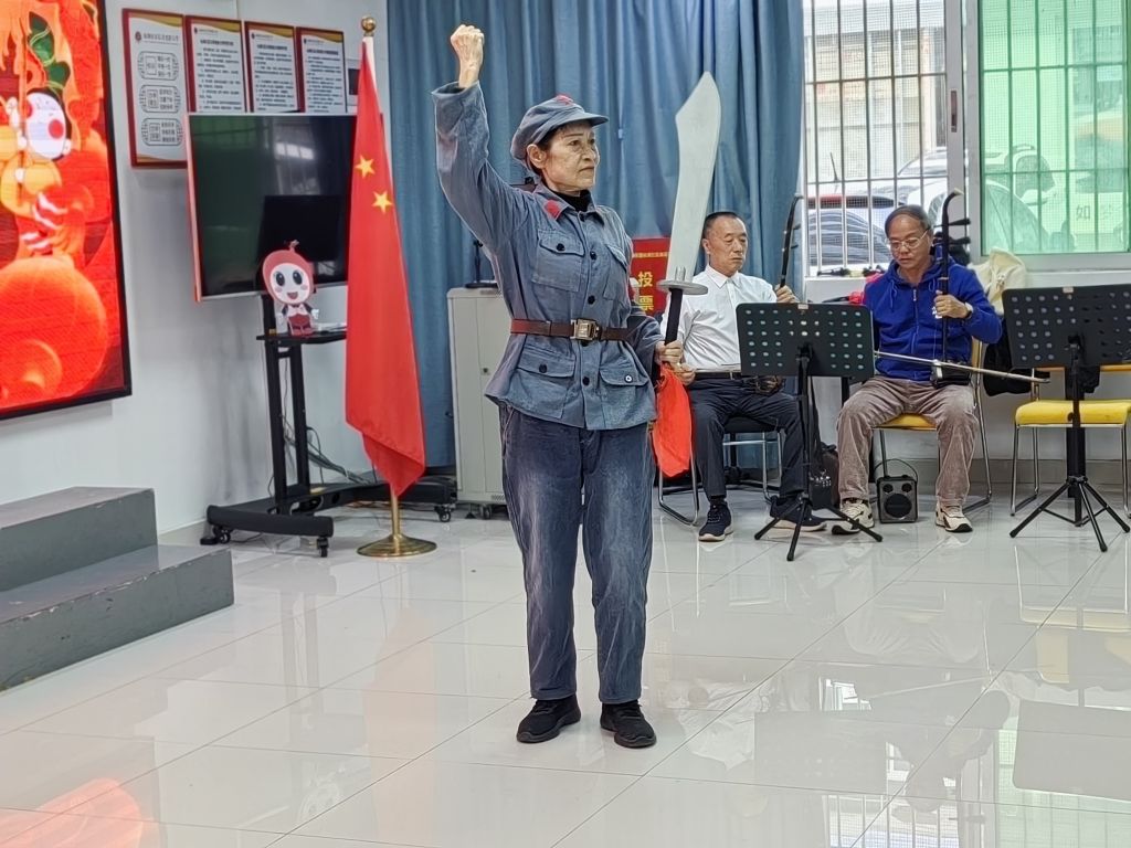 由社区退役老兵带来的《抗日大刀》表演,将演出推向了一个小高潮。表演者刘艺春虽已年迈,但挥舞起大刀来依旧虎虎生风,眼神坚定,一招一式尽显当年保家卫国的豪情,赢得了全场热烈的掌声。3 Q$ S7 [ _2 @4 b