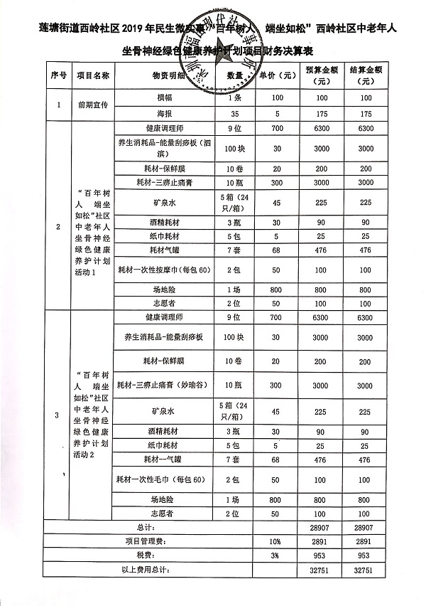 西岭社区2019年民生微实事“百年树人 端坐如松”中老年人坐骨神经绿色健康养护计划项目决算表