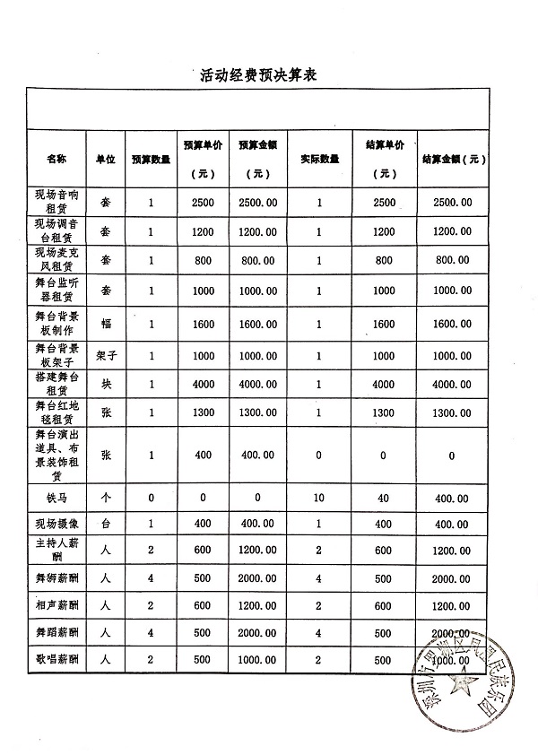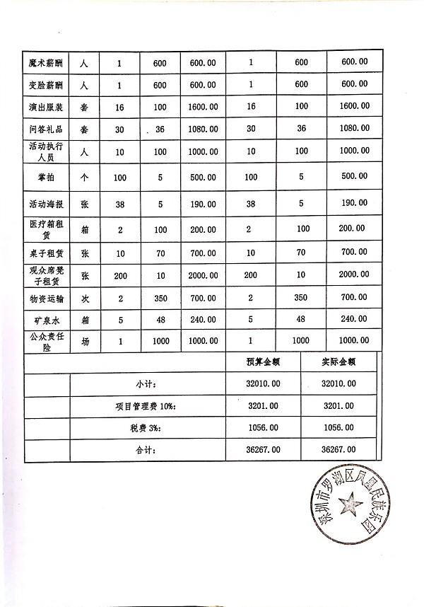 罗湖区2019年民生微实事“不忘初心,同心同行”西岭社区庆建国70周年文艺活动决算表