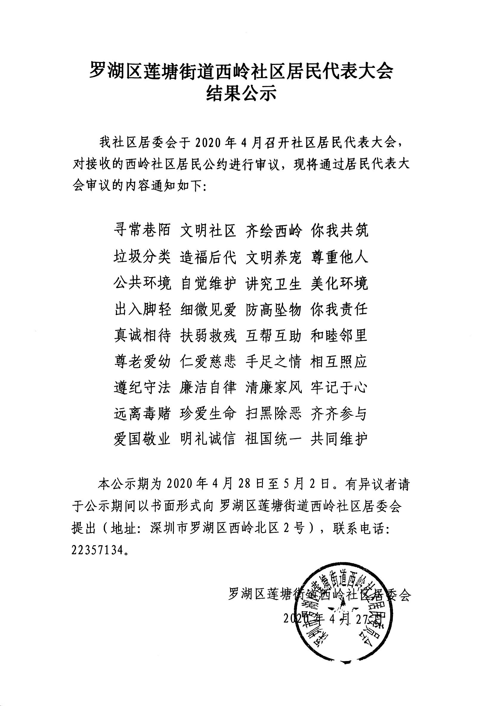 罗湖区莲塘街道西岭社区居民代表大会结果公示
